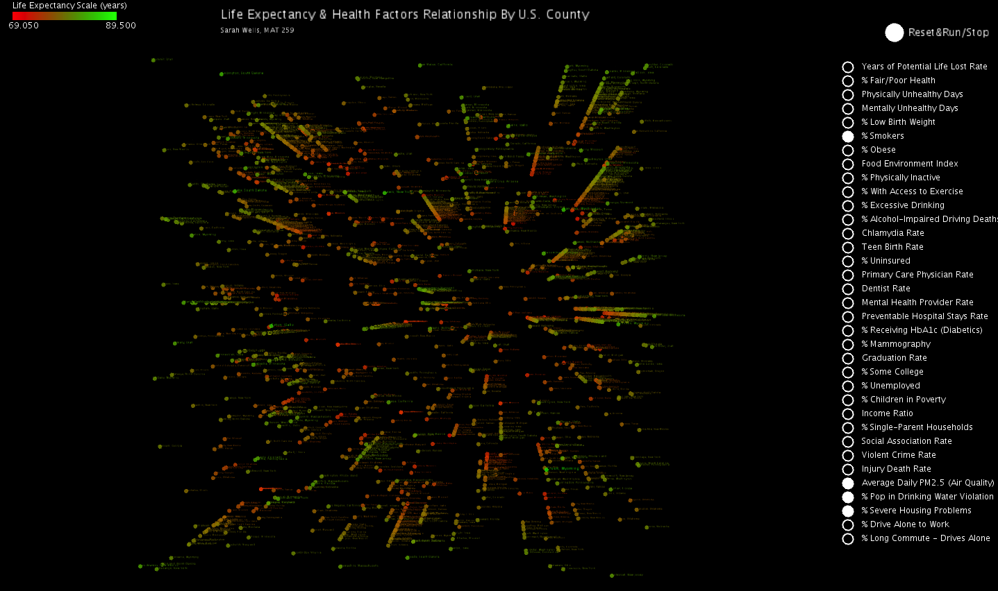 Screenshot 1: Shows organization based on % Unemployment, % Children in Poverty, % Severe Housing Problems. This also shows the ability to hover over to display the County, State, selected factors, and life expectancy. Screenshot 2: Keeping the data trained using % Unemployment, % Children in Poverty, % Severe Housing Problems, we additionally select Graduation Rate. This reorganizes the data using the additional Graduation Rate factor. The similarity in overall shape indicates not much difference between this and using only the initial three factors. One can infer a positive relationship between these factors. Screenshot 3: Similar to screenshot 2, we keep the data trained from % Unemployment, % Children in Poverty, % Severe Housing Problems and add % Smokers. We see the data becomes a little more chaotic, this may mean a slightly weaker relationship between % Smokers and the first three factors than between Graduation Rate and those factors. Screenshot 4: I choose some environment/physical factors, this screen displays the overall organization. (% Smokers, Average Daily PM2.5 Air Quality, % Pop in Drinking Water Violation, % Severe Housing Problems), Screenshots 5-7: Using the above factor choices. I identify a clump of similar x-y coordinates indicating similar environmental/physical factors and similar low life expectancy. Hovering over a few, we see respective values for % Smokers, Average Daily PM2.5 Air Quality, % Pop in Drinking Water Violation, % Severe Housing Problems, Life Expectancy: