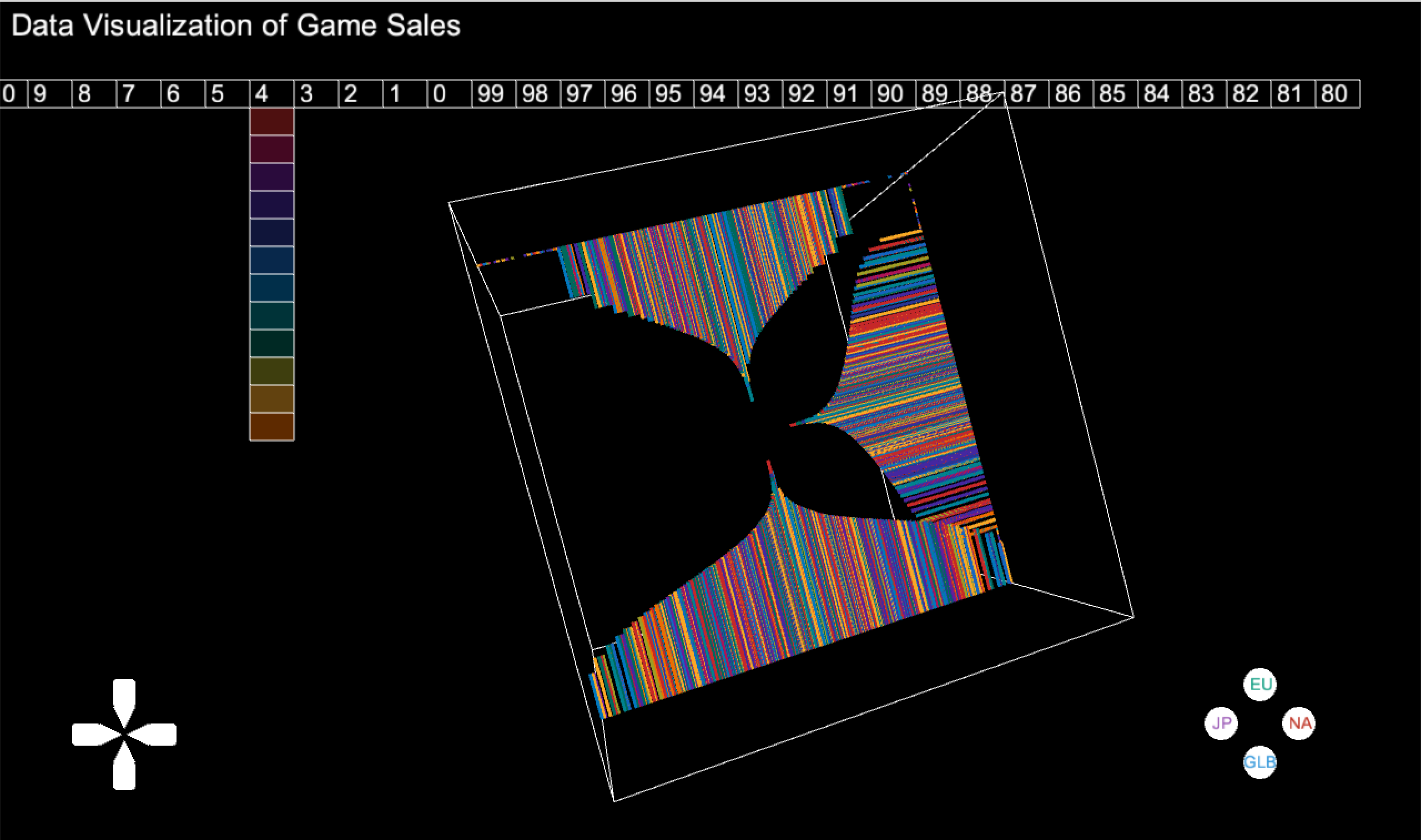 I used a cube to visualize the data. The four sides of the cube indicate four markets. The left side is the Japanese market, the top side is the European market, the right side is the North American market, and the bottom side is the global market. I design a gaming button to control the appearance of each side's visualization, the button is located at the right bottom and it is marked by the abbreviation of four markets.