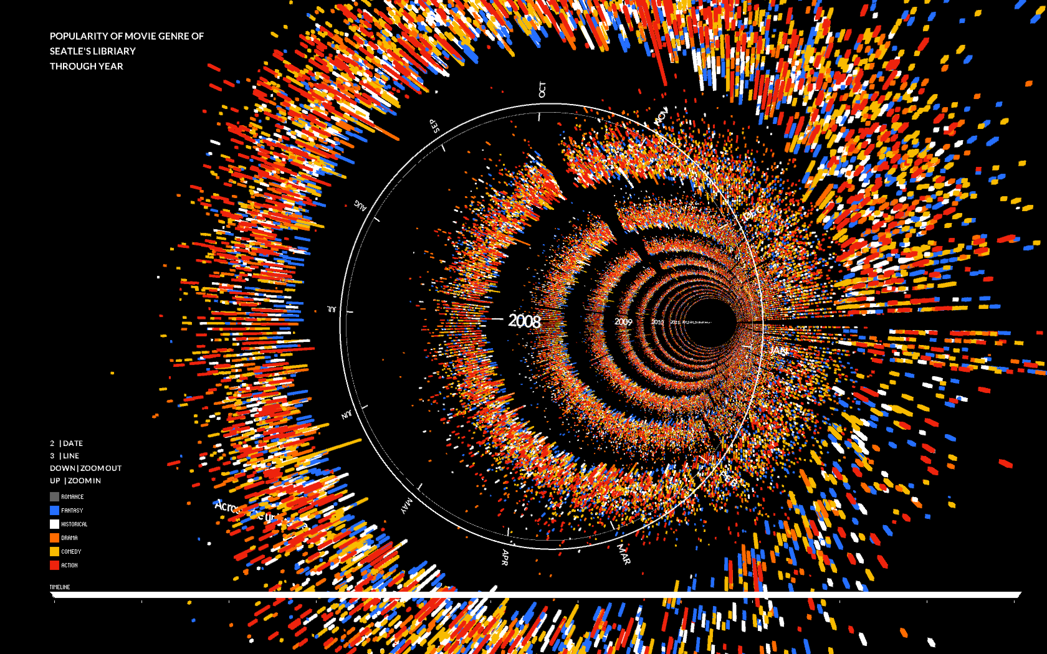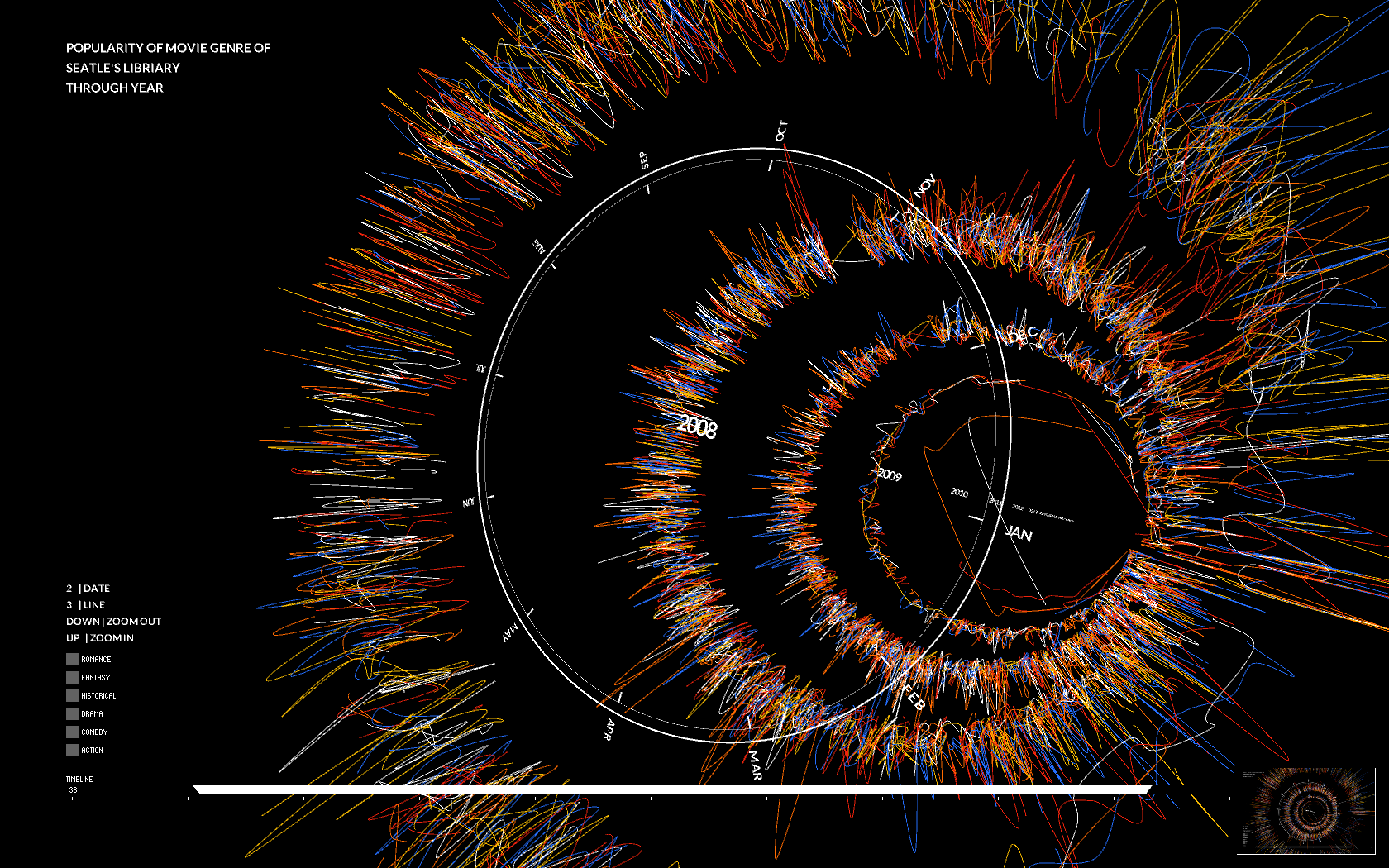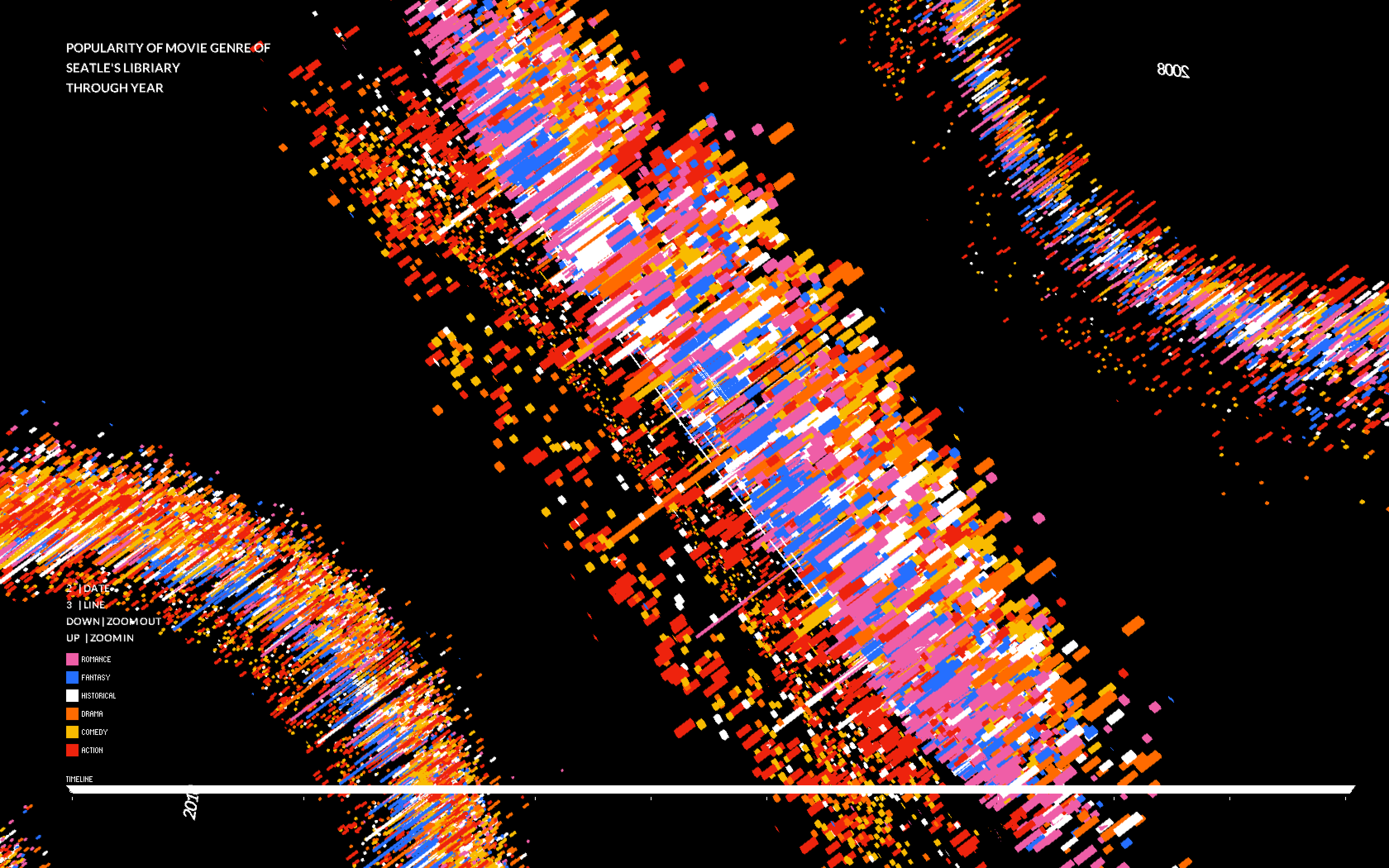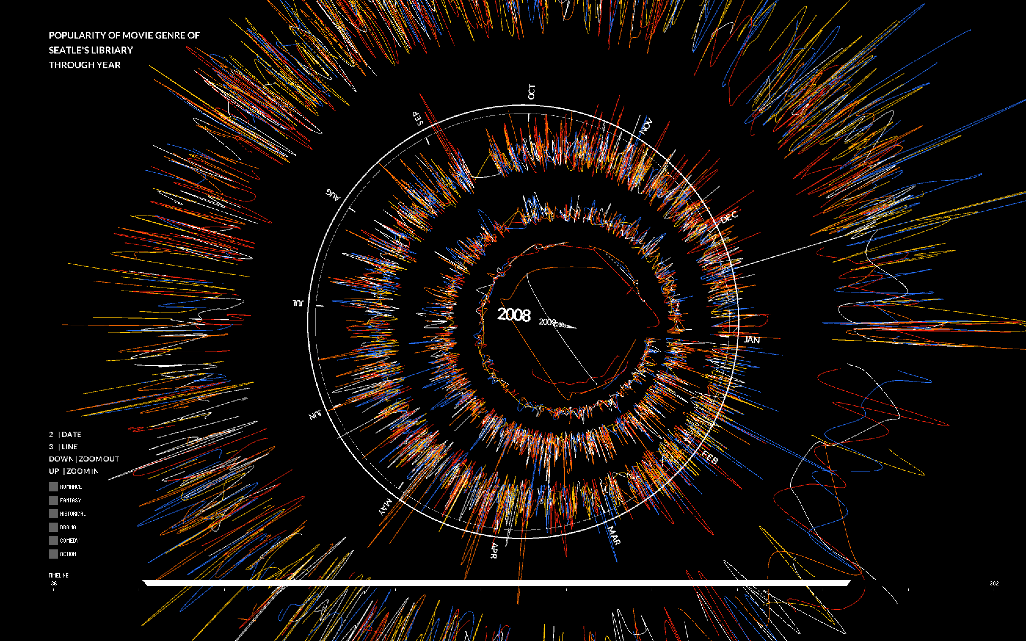 In my project, I use the shape of CD as outlook of the data visualization. All of the movies will be represented on the surface of the “CDs” using the shape of box with different colors(red represent action…). I use the edge of cds to measure dates. There are 12 months in total. I have tried the linear measure to see the result but the outlook of circle shape could present all on the screen so it will be most effective way to compare data everyday. I use controller to filter out data on special day of season, so the viewer can see clear comparison of genres on special period. The Radius distance present the counts of renting of each movies. The counts increase from the centre of a circle to the edge of a circle. Meanwhile I use animation of jumping speed and length of box to measure the renting duration of each movies. The shorter of length and fast speed of jump, the shorter time of each dvds being out of library at least. In this way, I could explore which movie genre will be kept for long time to memorize or repeating, which is more like Popcorn movie. There will be 10 years of renting records and I use vertical dimension to present for each year. And I use the camera to travel through the year for the clear look of data.