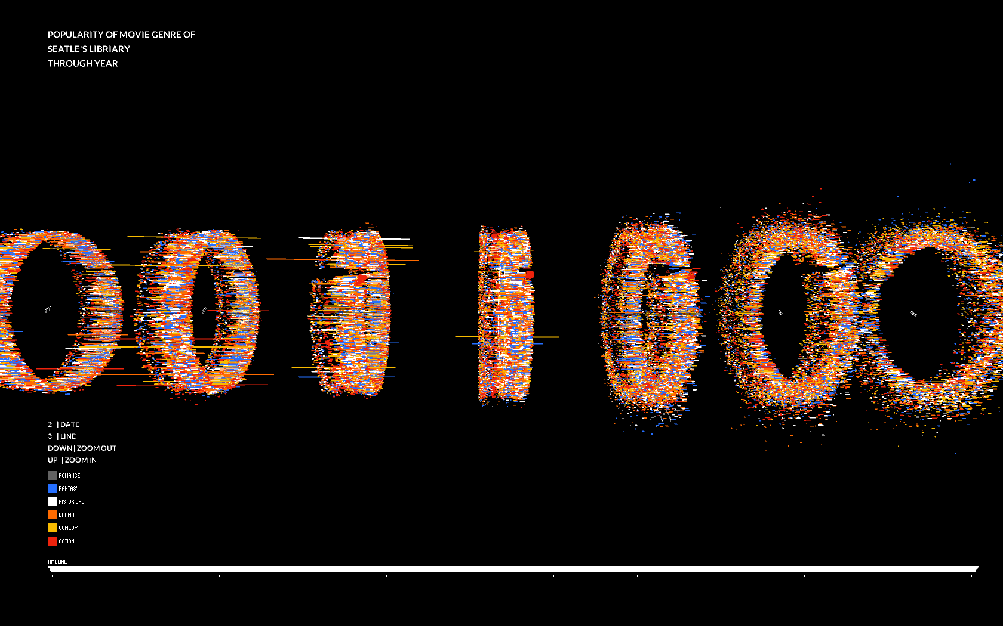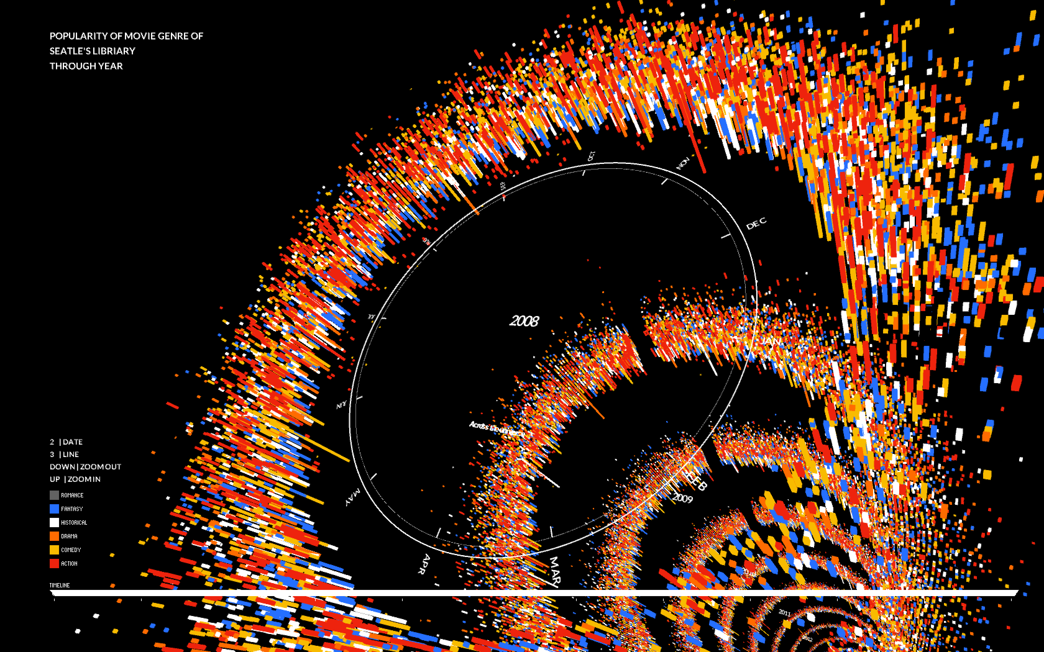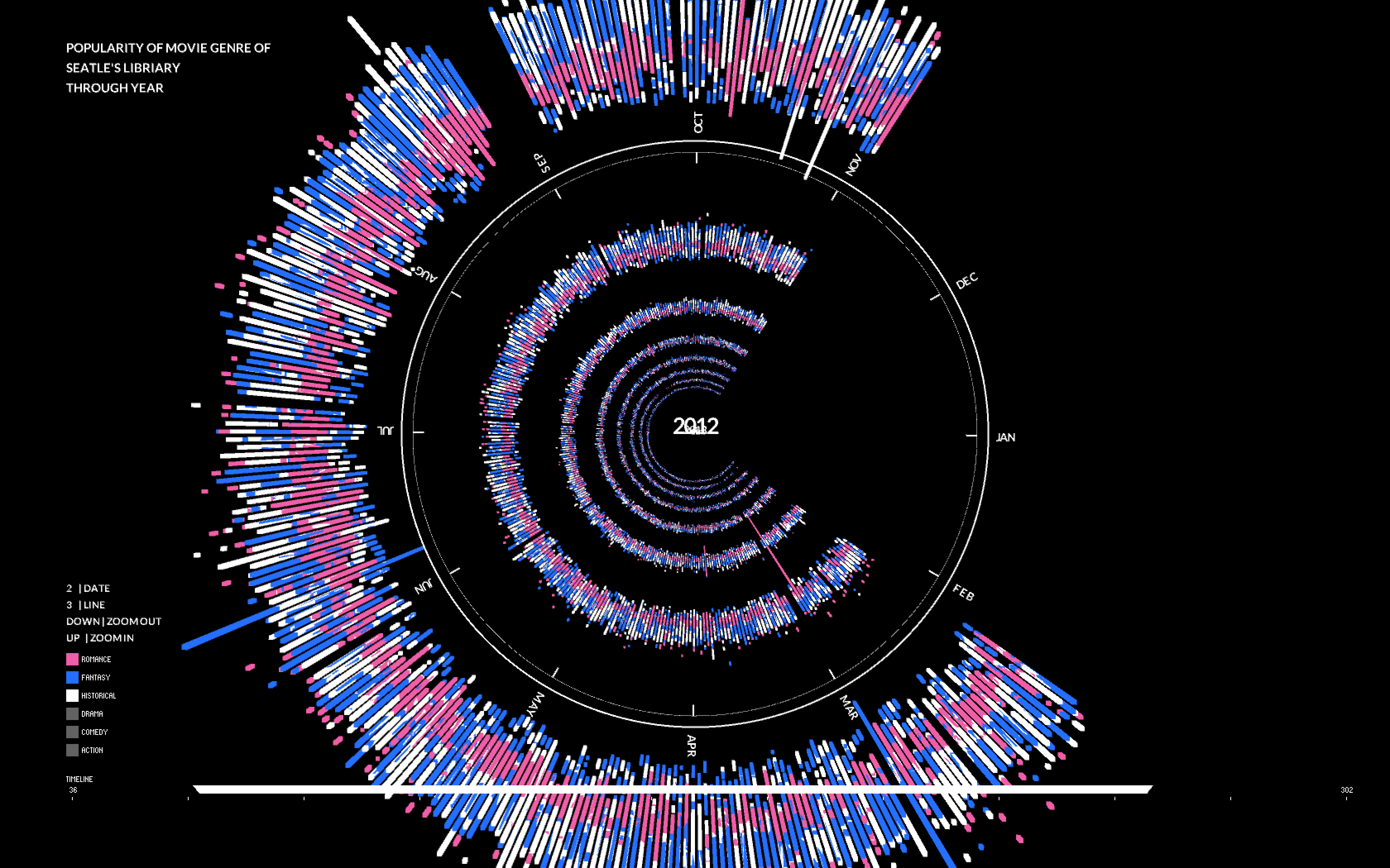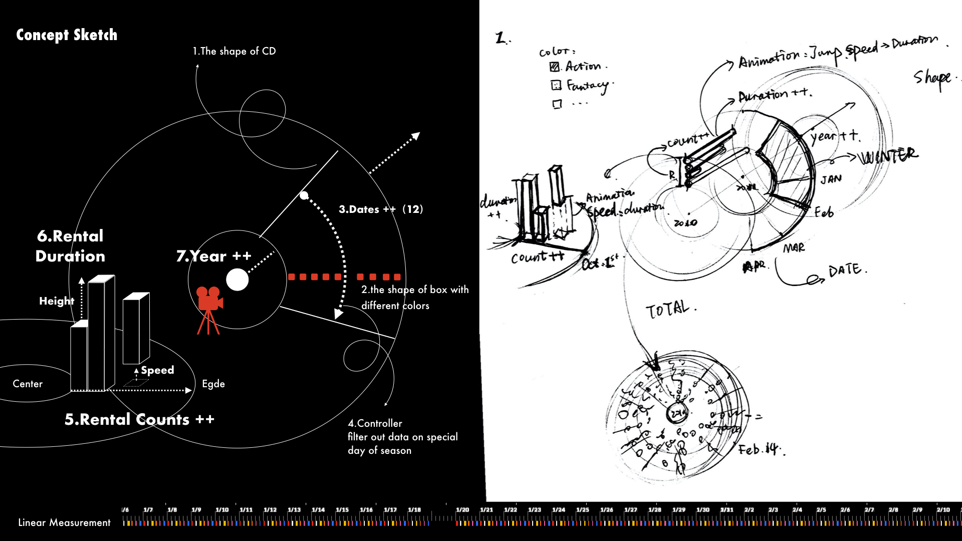 In my project, I use the shape of CD as outlook of the data visualization. All of the movies will be represented on the surface of the “CDs” using the shape of box with different colors(red represent action…). I use the edge of cds to measure dates. There are 12 months in total. I have tried the linear measure to see the result but the outlook of circle shape could present all on the screen so it will be most effective way to compare data everyday. I use controller to filter out data on special day of season, so the viewer can see clear comparison of genres on special period. The Radius distance present the counts of renting of each movies. The counts increase from the centre of a circle to the edge of a circle. Meanwhile I use animation of jumping speed and length of box to measure the renting duration of each movies. The shorter of length and fast speed of jump, the shorter time of each dvds being out of library at least. In this way, I could explore which movie genre will be kept for long time to memorize or repeating, which is more like Popcorn movie. There will be 10 years of renting records and I use vertical dimension to present for each year. And I use the camera to travel through the year for the clear look of data.