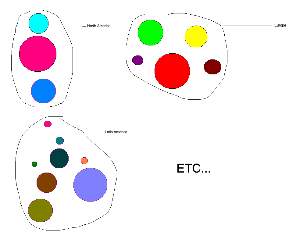 I envision that each country is represented as a sphere (see picture). The size of each sphere is proportional to the number of migrants living in the country it represents. To tell each country apart, each sphere has a different color. There will be a toggle that allows the user to switch through different years. On rollover, some country data is displayed.