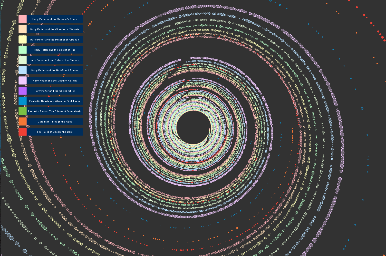 As you can see, besides the five circles, the specific book points also construct five book circles bigger than the original five country circles. Because I calculate the coordinates of every book point based on the book country attribute and the radius of the corresponding country circle. These book circles also have the same features with the country circles.