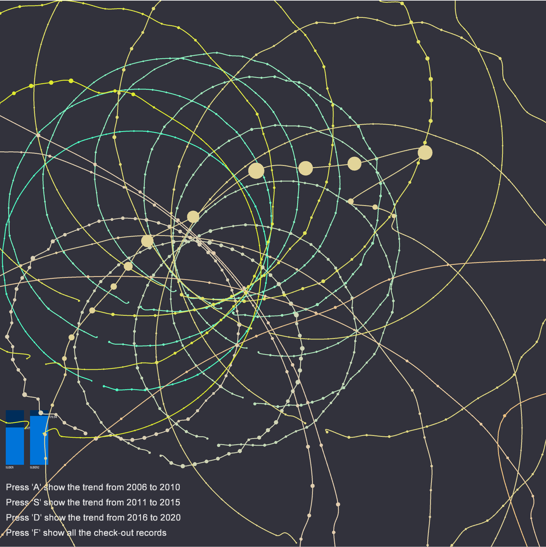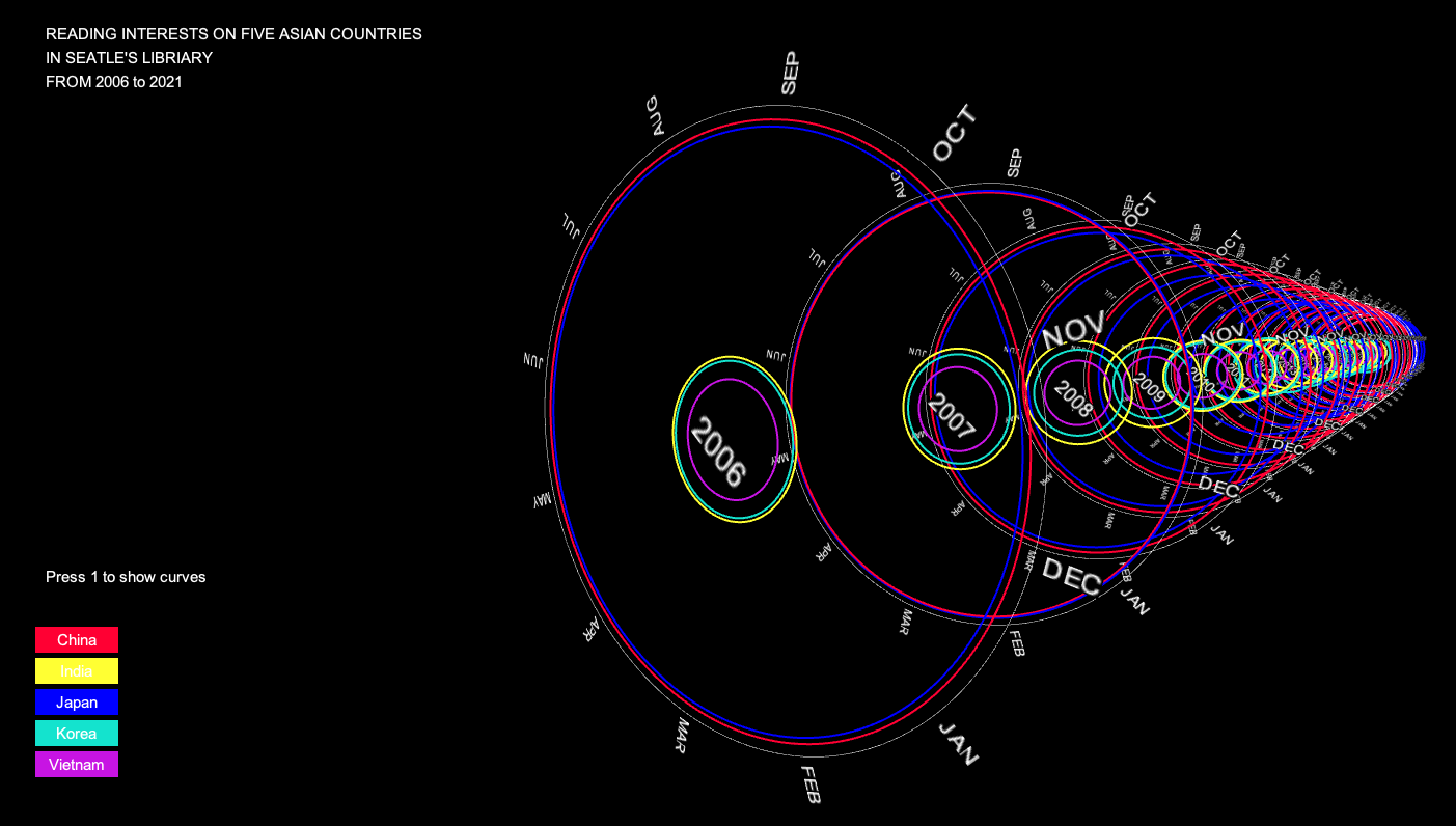 Firstly, I chose China, India, Japan, Korea and Vietnam as five research countries. And then I designed two SQL queries to search the total check out counts of these five countries and the check out details (including related country, bibNumber, title, date and counts) from 2006 to 2021. After that, I made use of Processing to visualize the multi dimensional data in 3D format.