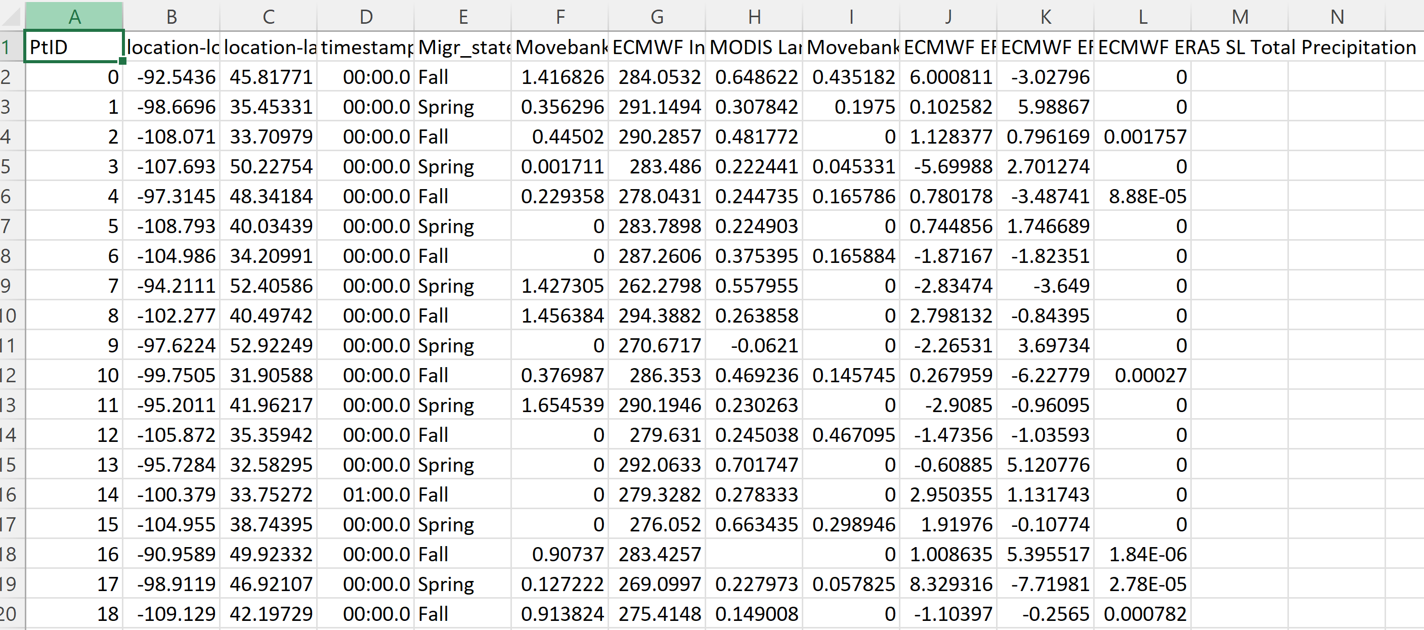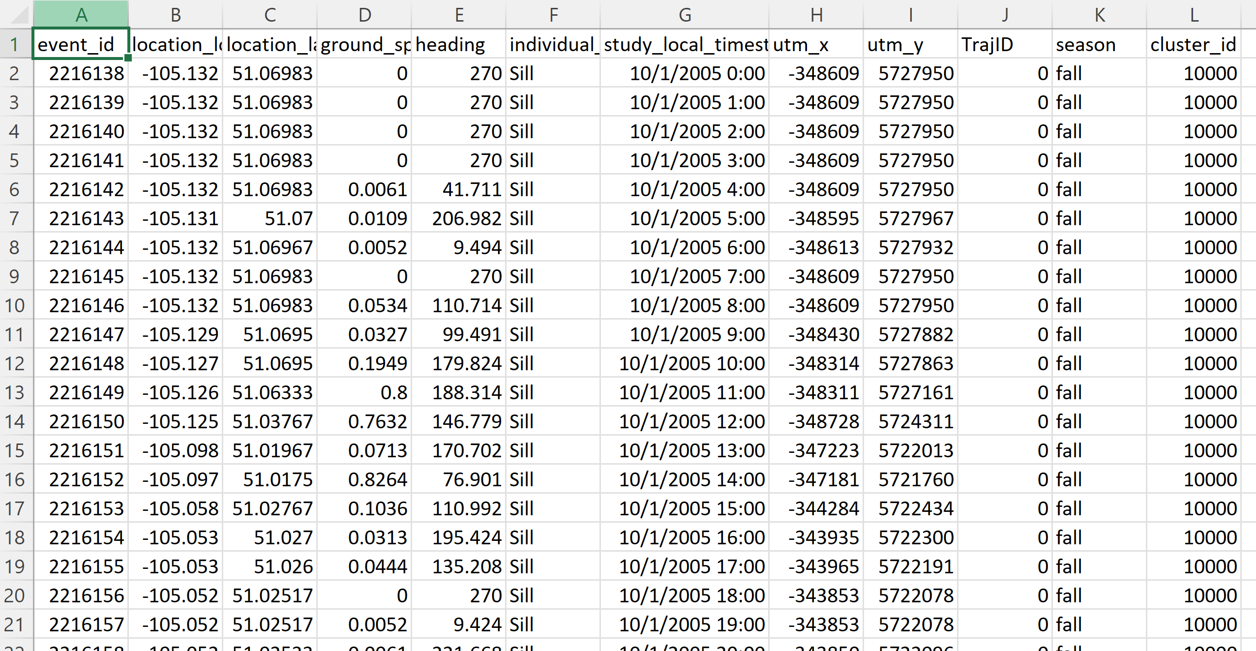 17112 sample points in total Turkey vulture dataset: tracking points recorded. Note that in the field "cluster_id", 10000+ represents fall migration and 20000+ represents spring migration.