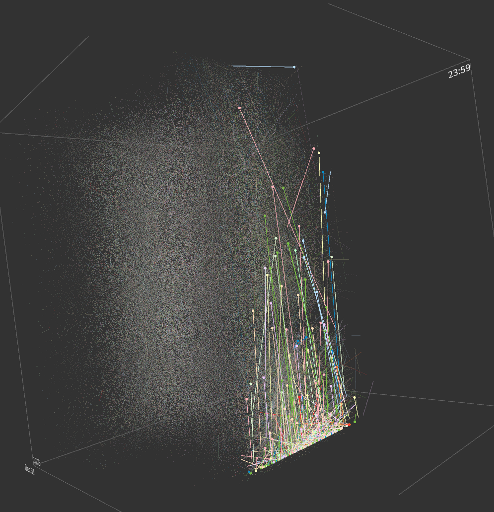 The data should be relevant and granular, meaning that there should be a significant density of data to be visualized in 3D space. Each data’s x,y,z position should be directly defined by the data’s values. Preference is for the data to determine the visual form, rather than matching data to an existing form, for instance, a geographic map has a pre-determined visual/spatial organization.