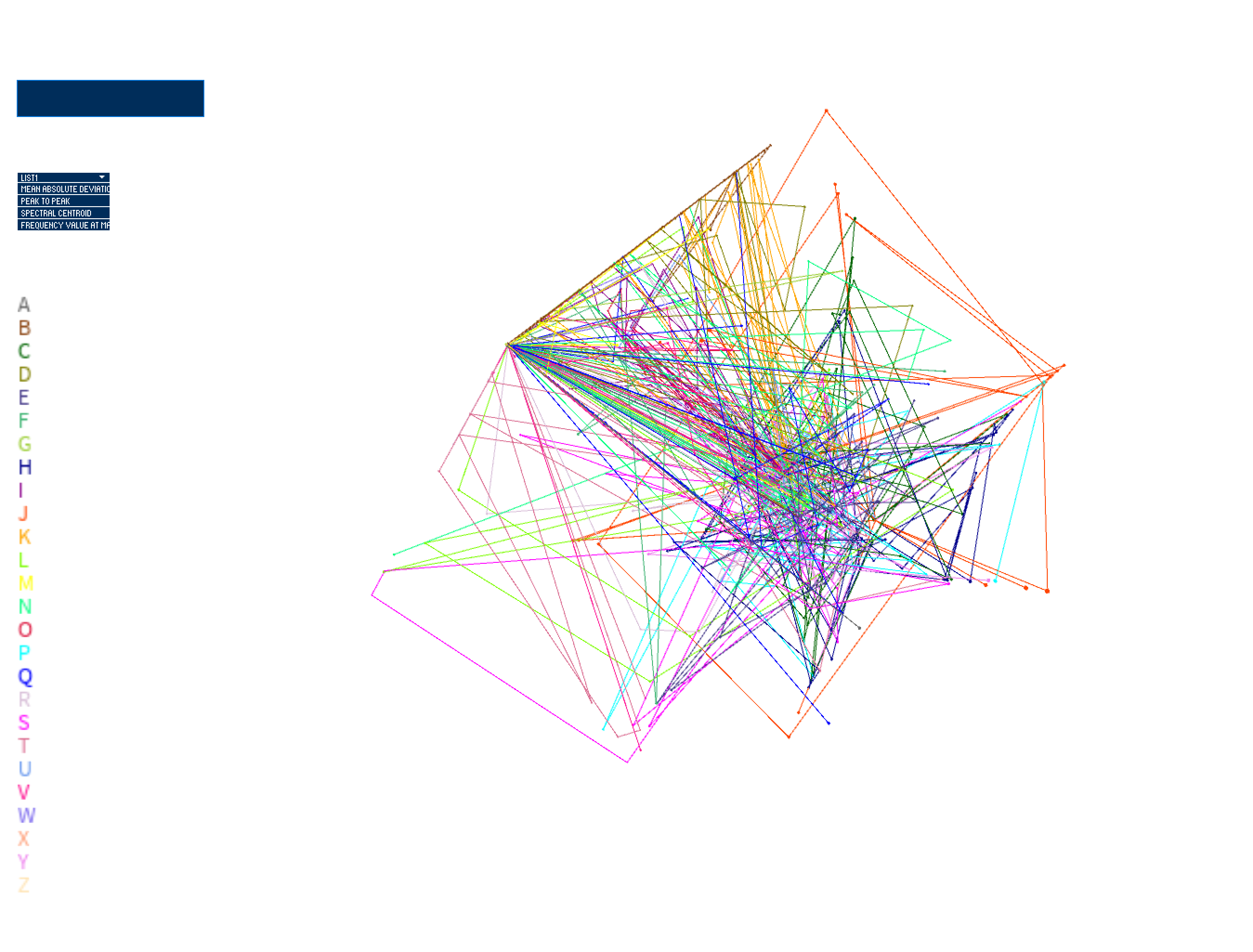 The visualized feature (in the position and movement of the data points) is now controlled by a controlP5 dropdown menu (implemented 5 features out of the 24, but I want to see if I can use PCA or other data compression methods to make this more interesting rather than having a dropdown menu containing 24 visualization options).