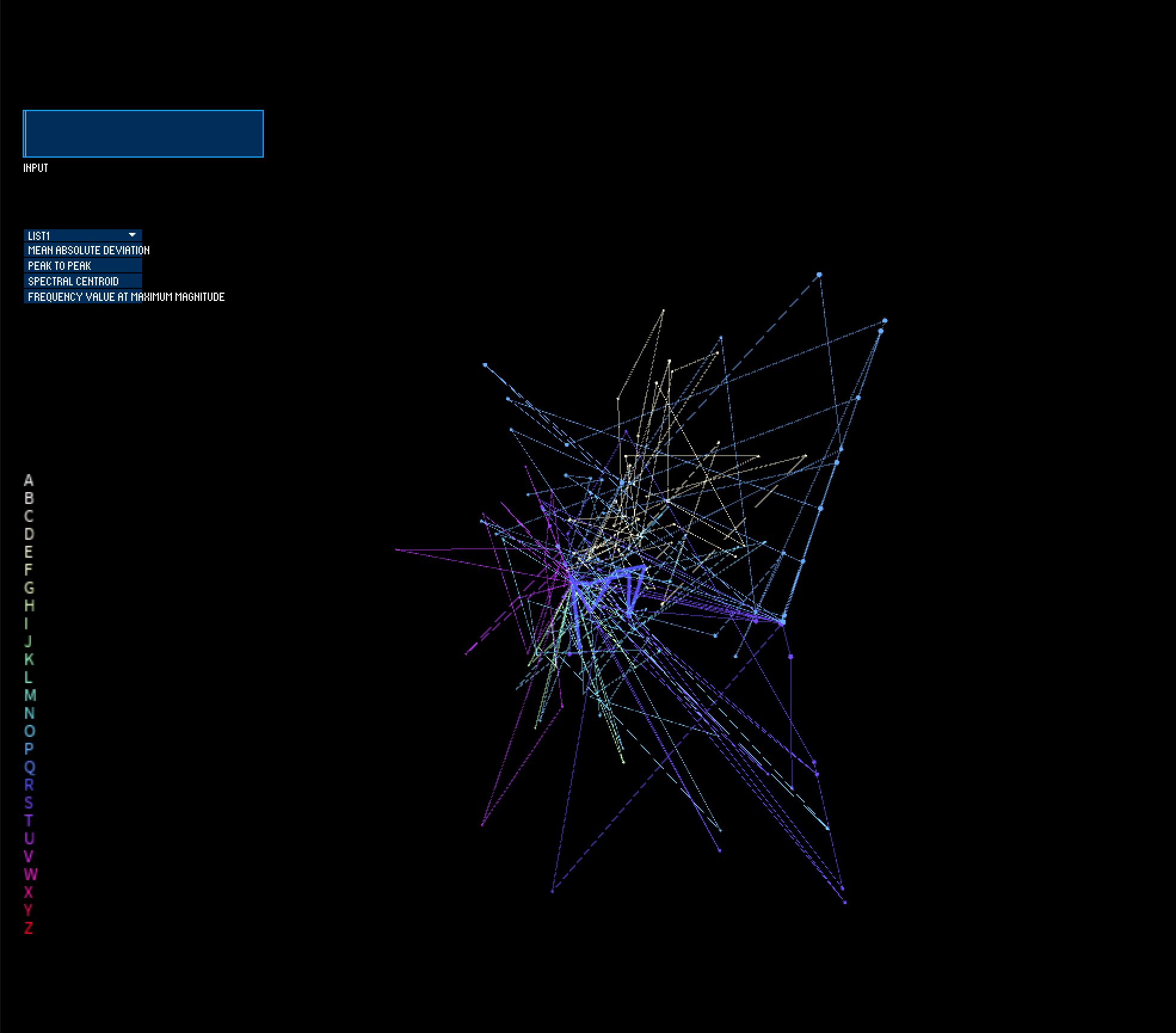 System Overview: A user would interact with the system by typing in a word and seeing a geometric form emerge from the motion of data points through space. Each row of data (one trial of one letter) contains one value for 96 features, placing it in the space of a 96-dimensional coordinate system (when considering each feature as a dimension or axis.) I will then use PCA or t-SNE to compress my 96-dimensional feature data into 3 axes (X, Y, Z) to visualize in Processing. The combinations of letters of the input word will make up the geometry of the resulting form, where multiple instances of a letter will exhibit greater influence of that letter in the structure/architecture. In this way, the "genotype" of feature values yield a specific "phenotype" (or generated 3D form) for each letter, which, when used as building blocks and chained together to form words, become forms. Communication via the tactile sense becomes digitally inscribed into geometry.