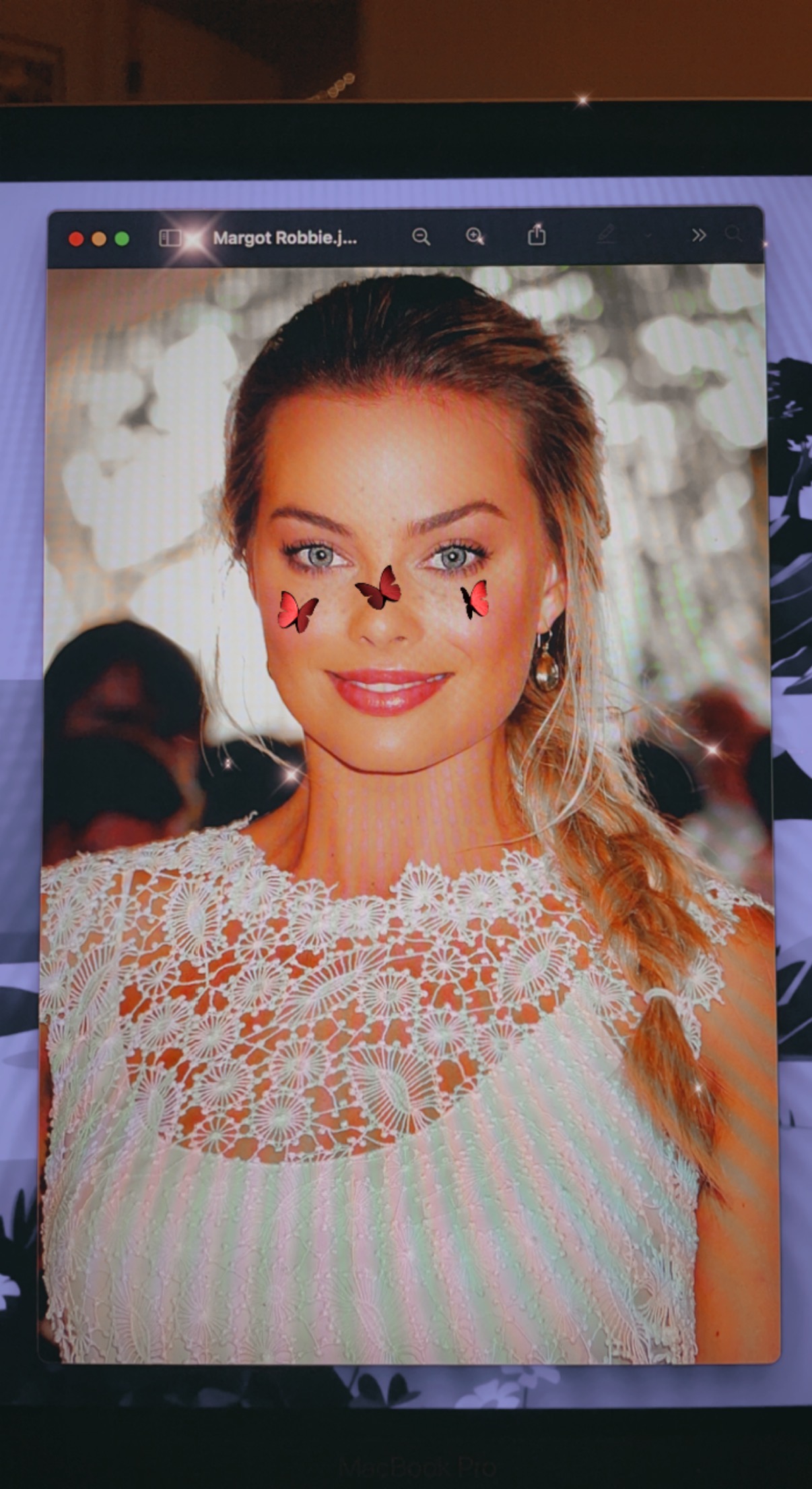 Here is a picture of Margot Robbie I found on the internet. I then used two filters that were easily accessible on snapchat just over her face. As you can see, even though the main purpose of the butterfly filter and the sparkle filter is to have fun butterflies and sparkles over the image, that's not all the filter does. The filter brings the jawline slightly in for a smaller jaw, makes the nose smaller, and widens the eyes a bit. The difference is so subtle, but it makes the person applying the filters believe that if they could only fix these things about themselves, they could look like the images presented by all the women on social media.