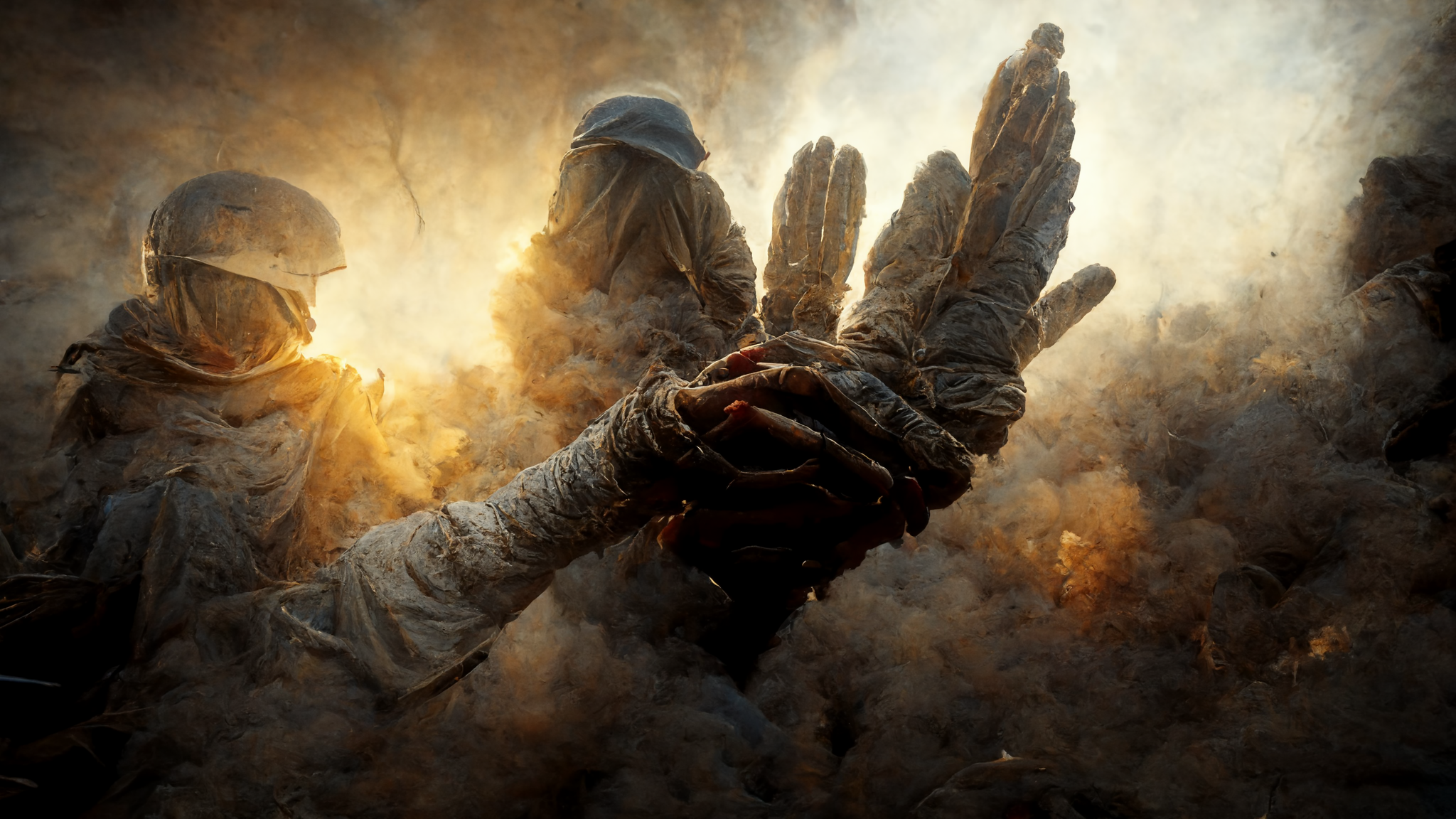 "Counter Strike" contributed to the militaristic aspects, "angels" contributed to the dramatic lighting, "hands first person" contributed to the hands and mixed with "Counter Strike" to create hand-like people (more on that later).