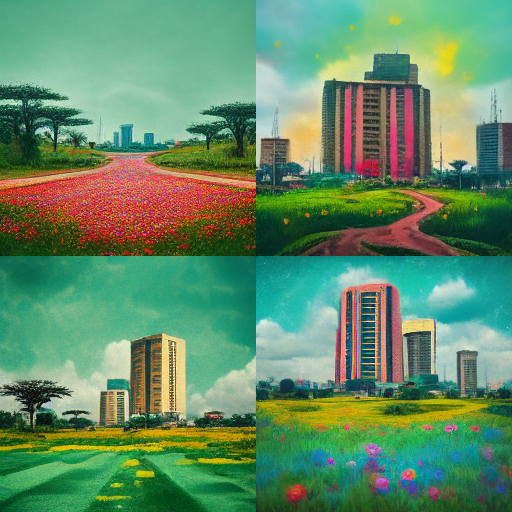 This week, I try to use the Midjourney bot to "imagine" the city of botanical futures--the New Delta, Nigeria. The first time Okorafor gives out a detailed description of the city comes with pictorial imaginations: "In the area between New Delta’s low skyscrapers, buildings and homes were carpeted with its world-famous stunning green grass, and the roads were fringed with it, but in this scene the grass was covered with smiley-faced bopping periwinkle flowers. It looked ridiculous, like one of those ancient animations from the early 1900s or a psychedelic drug–induced hallucination."