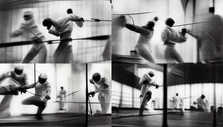 prompt: DALL·E 2022-09-30 10.25.11 - Stroboscopic, Chronophotograph, fencing, white suits, illford, side-view, series, long, many