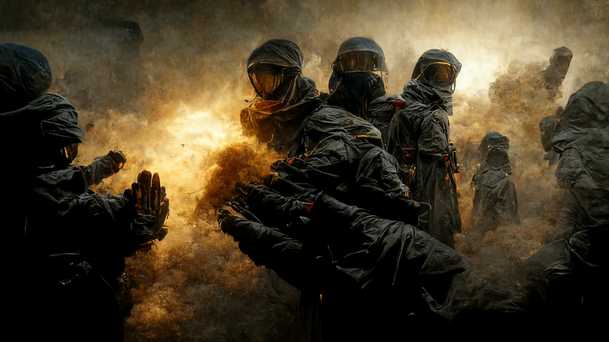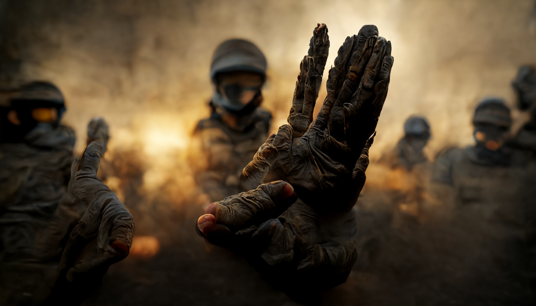 "Counter Strike" contributed to the militaristic aspects, "angels" contributed to the dramatic lighting, "hands first person" contributed to the hands and mixed with "Counter Strike" to create hand-like people (more on that later).