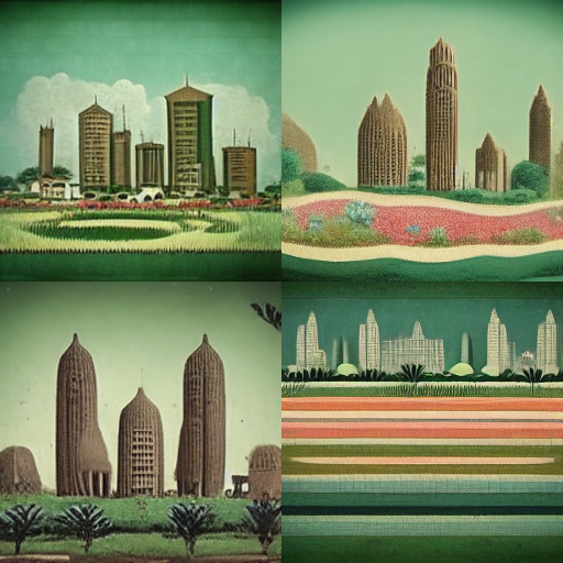 Apparently, the "ancient animations" part of the prompt is a "strong" stylistic indicator in comparison with the "hallucination" of the second prompt so the result came out with a clear stylistic inclination. With the guidance of animation style, the image also came back with a stronger futuristic form as we can see the skyscrapers built in a traditional Nigerian-style house--a very organic, woody, and porous structure.