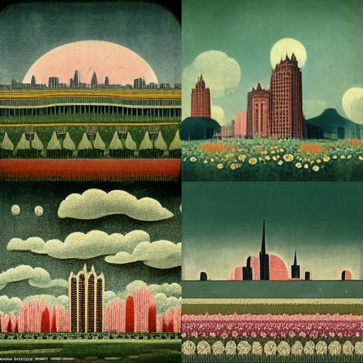 This week, I try to use the Midjourney bot to "imagine" the city of botanical futures--the New Delta, Nigeria. The first time Okorafor gives out a detailed description of the city comes with pictorial imaginations: "In the area between New Delta’s low skyscrapers, buildings and homes were carpeted with its world-famous stunning green grass, and the roads were fringed with it, but in this scene the grass was covered with smiley-faced bopping periwinkle flowers. It looked ridiculous, like one of those ancient animations from the early 1900s or a psychedelic drug–induced hallucination."