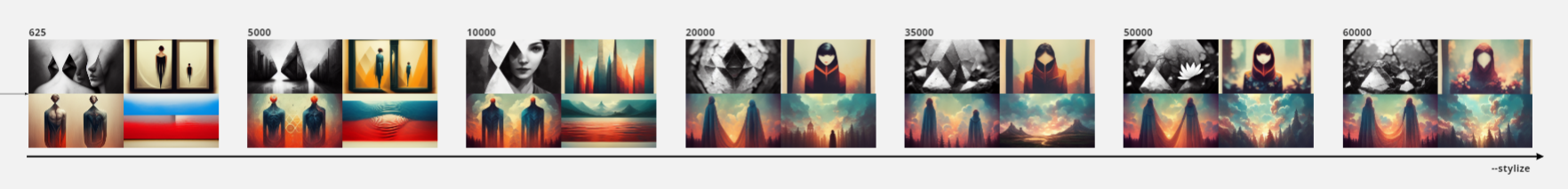One last parameter tested is the stylize parameter. This parameter seems to be adding more and more content inside the image composition as its value increases.