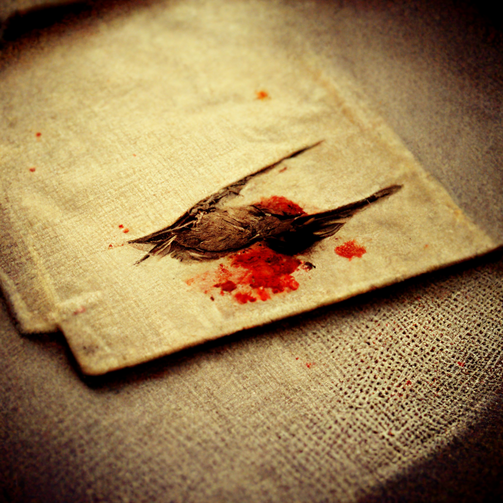 This was the prompt for the bird image: Lord, how unutterably disgusting life is! What dirty tricks it plays us, one moment free; the next, this. Here we are among the breadcrumbs and the stained napkins again. That knife is already congealing with grease. Disorder, sordidity and corruption surrounds us. We have been taking into our mouths the bodies of dead birds. (It is a Virginia Wolfe quote.)