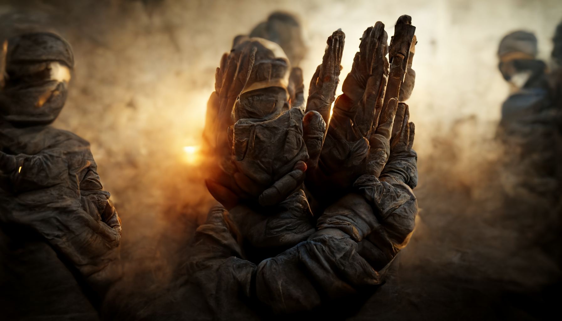 "Counter Strike" contributed to the militaristic aspects, "angels" contributed to the dramatic lighting, "hands first person" contributed to the hands and mixed with "Counter Strike" to create hand-like people (more on that later).