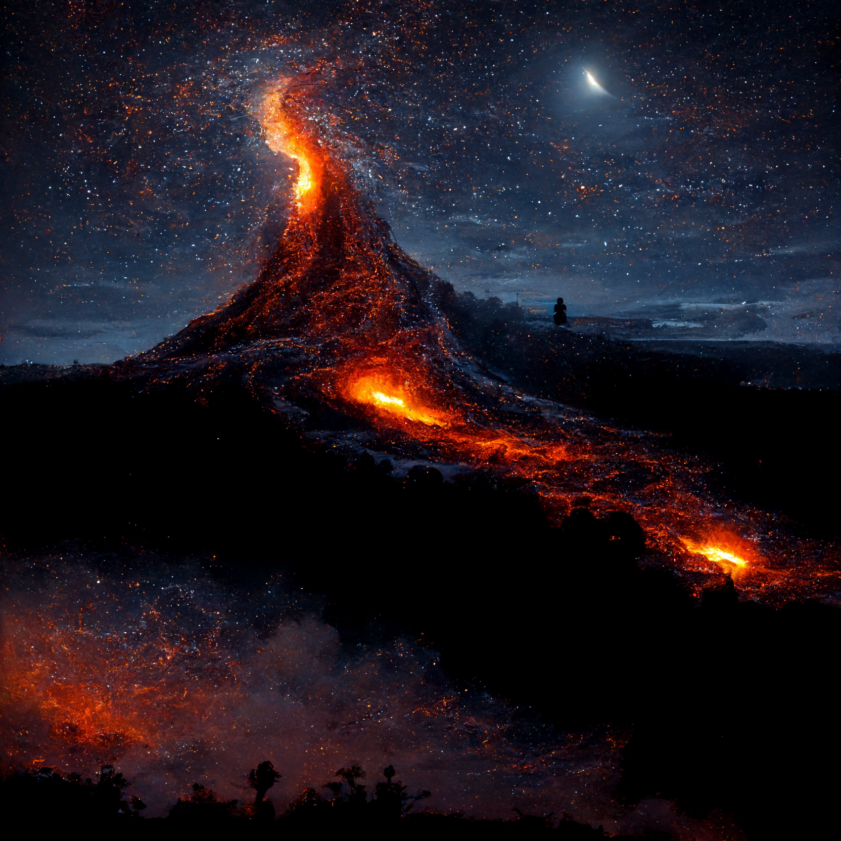 The image meets most of my expectations. It contains all the elements I want. Although not very realistic, the image still looks magnificent. My only complaint is that the lava eruption gets blurred with the stars.