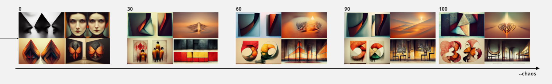symmetry::0 asymmetry::1 --no sky --ar 16:9 --seed 4776 --chaos x symmetry::1 asymmetry::0 --no sky --ar 16:9 --seed 4776 --chaos x In the higher ranges, this parameter seems to keep the image's content and morphs it into something more complex. In the first image above, the pictures in V3 iteratively get more complicated with the introduction of more elements, and when we assign chaos as 100, the text starts showing up. This might be due to the high-frequency nature of fonts.