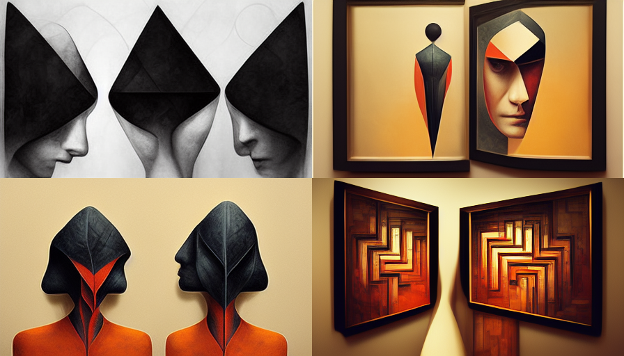 As a starting point, I wanted to see how Midjourney prompt parameters affect the output of an image. This website was influential on the parameters I picked. I tried different values of keyword weights, chaos, and stylize commands with a rudimentary prompt: symmetry asymmetry. This prompt was motivated by an exploration revealing how Midjourney perceives higher-level compositional concepts instead of a categorical representation of image subjects.