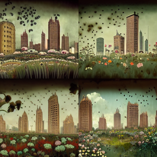 However, I was trying to look for some images that were more centralized on representing the pollen influence in an urban environment. After a couple of variations (of the second image of the first generation), I finally got something like this: A "pollen storm" emerged in the first image of this generation and a variation of this image gave me something like this: The pollen effect became even more obvious which I really appreciated. As Jack would say: variations are the key for Midjourney creation.