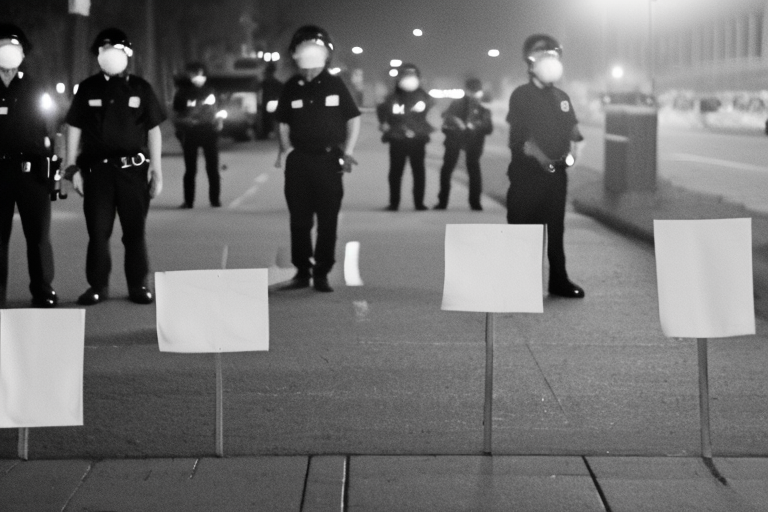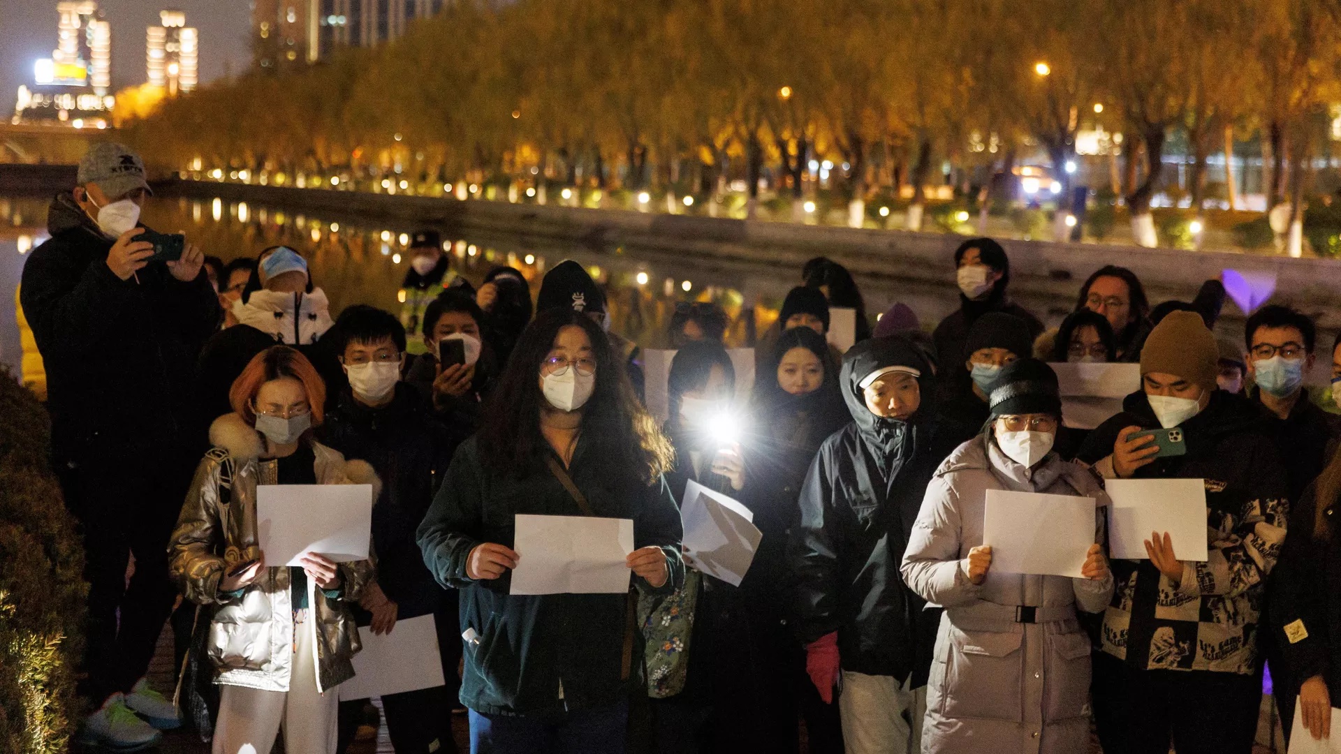 prompt = "Chinese people protesting against covid-19 and police on the street and holding empty white letter-sized paper in midnight in photorealistic journalism style"