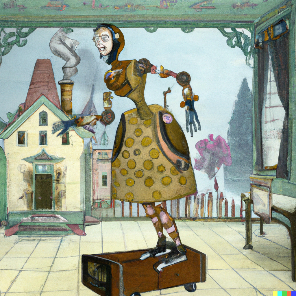 DALL·E 2022-12-01 09.36.42 - a pregnant woman, a robot home, pollens, animations from the early 1900s.png