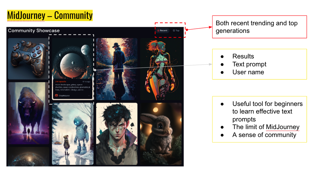 Regarding interaction, I think the HCI aspect of these tools significantly impacts their adoption. The fact that Midjourney runs on Discord is a little cumbersome for us -- people who are used to computer software-- yet it enables a whole different population to access these tools on their smartphones. Many Stable Diffusion-based web interfaces and the Dall-E website also allows similar audience who are not comfortable using terminal on their computers. Also, these models are taxing on computational resources, making it hard for widespread adoption because of the requirements of GPU computing power and VRAM.