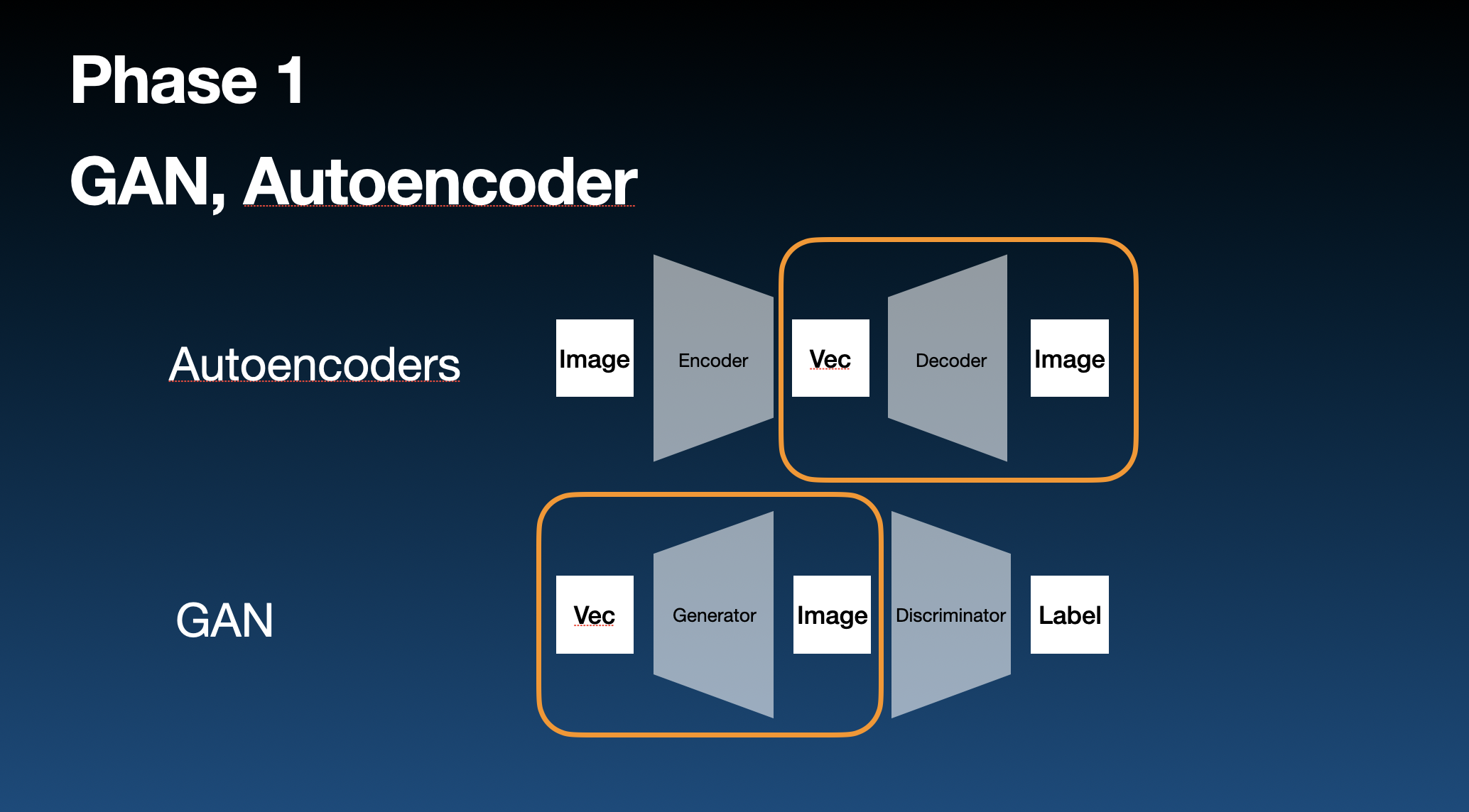 Phase 1: Both Autoencoder and GANs constructs a CNN model that maps a vector into an image. In other words, it creates a mapping from a vector space to an image space. The vector space is so-called "latent space". Animation were created by performing "latent walk", interpolation vectors from one known vector to the other known vector and create intermedia photos between the photos corresponding to the two known vectors.