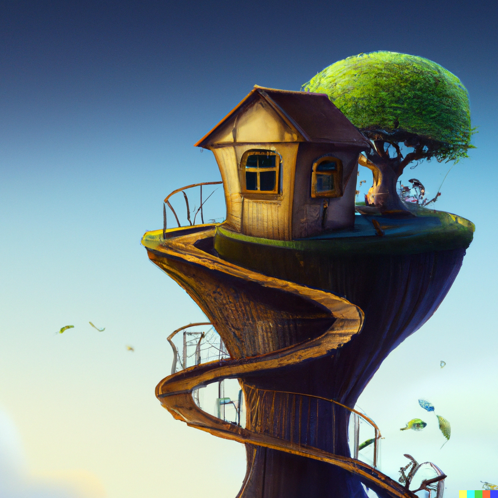 DALL·E 2022-12-05 12.12.43 - A photorealistic tree house on a mountain, a crooked path leading towards it.png
