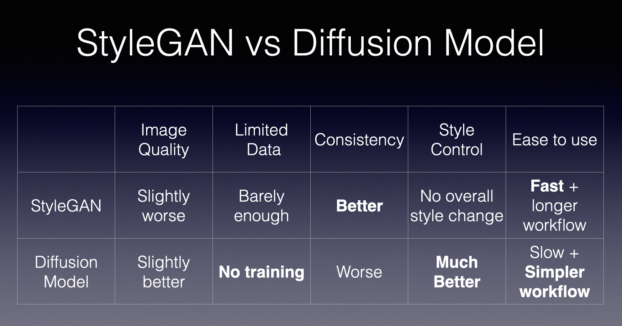Limited Data: The StyleGAN3 heavily relies on the dataset for training. My dataset with a size of 4000 pose-image pairs was barely enough to train it. What makes the Stable Diffusion shine is it never requires any training dataset to use it. It can be further fine tuned with a few samples of images to make the model specialized at generating certain type of photos.