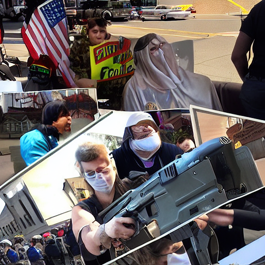 But a formal analysis can tell us something else. If a computational image is generated through a process of learning the input data sets, then could we consider the computational images as an archive of systematic or, as George poignantly pointed out, community biases? I want to use one of Jack’s generated images as an example as I think this is very much a haunting image of contemporary American society. In one of his images, generated with a prompt “first person shooter in a catholic church; 4k; ultrarealistic; protestors in a strip mall,” we see a collage of seemingly newsreel shots. Without showing any actual faces, the image display shocking details of costume and scenes of possible religious conflicts and gun violence.