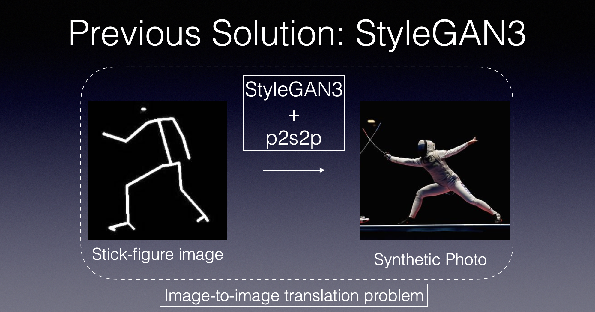 It was achieved with StyleGAN3 model trained on cropped fencer photo, and a p2s2p style encoder trained on pose-photo pairs. Once the two models are trained, given an arbitrary pose, the p2s2p encoder can encode the pose image (stick-figure image) into a latent style code, which will be feed into StyleGAN3 to generate a cropped fencer photo.