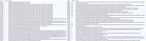 I have queried the entire dataset and retrieved 3,207,172 rows in 307 seconds. Attached is a sample of the data. The data shows correlation between two identical bibliographical items A and B with unique bibNumbers (copies with different format are treated as one bibliographical item). From this spreadsheet, further concurrence frequency can be counted such as A_dewey to B_dewey, A_dewey to B_subject, A_subject to B_subject. These three frequencies are important to me because I’m interested in visualizing these correlations in an agent-based swarm simulation. The aggregation of these frequencies will determine the attraction/repulsion force from A to B, not necessarily from B to A, when two random bibliographical items meet.