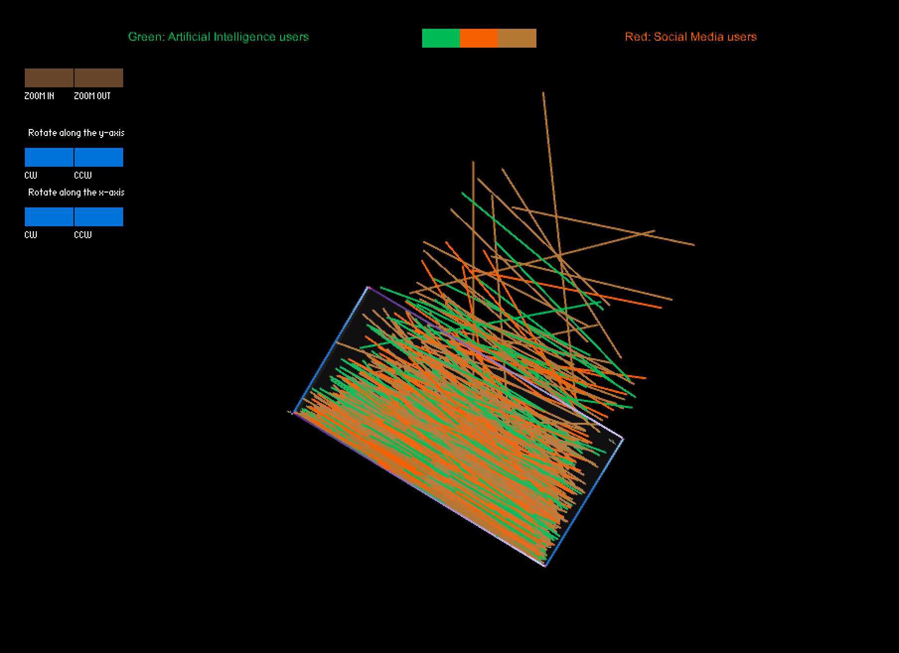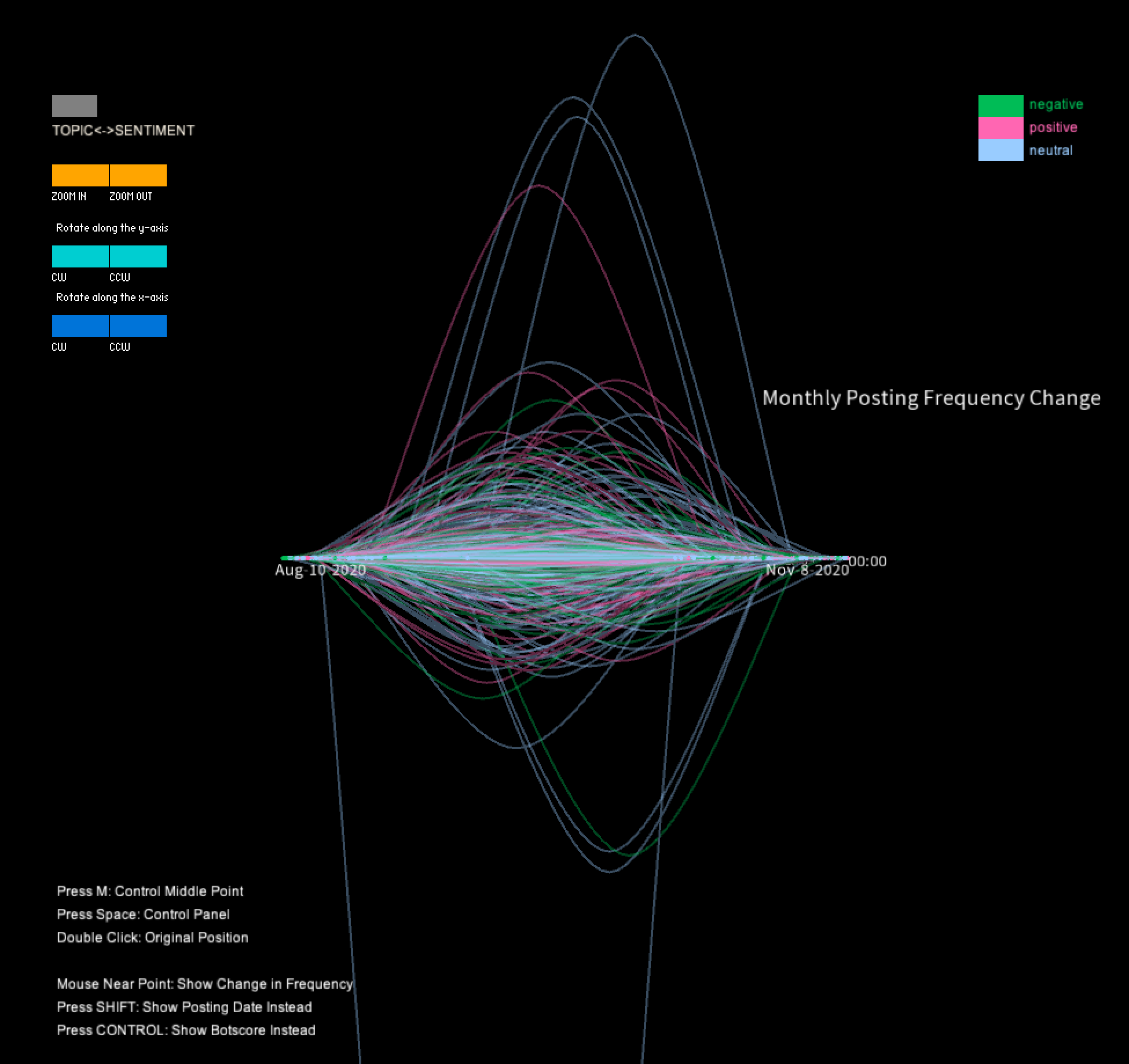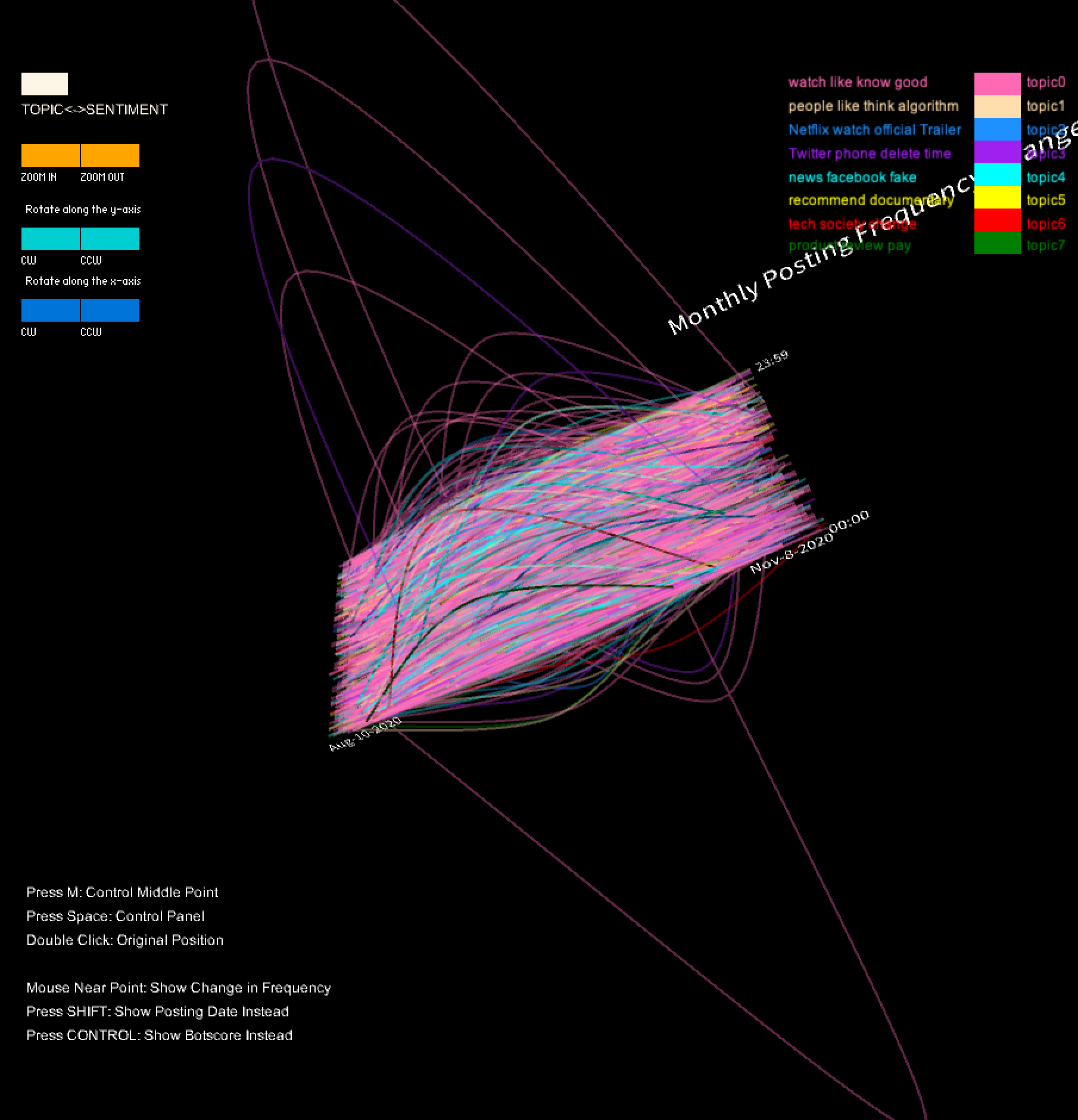 This is the first model I created for the Social Dilemma Twitter dataset. Three color presented three sentiments (neutral, positive, negative). As seen from the screenshot, most lines collapsed at the bottom of the previous model and it was difficult to discover patterns. I am planning to use a new 3D model (create a curve for each user instead of a straight line; the height of the curve depends on the difference between the post frequencies of the user 30 days before and after; if the frequency increases, the curve will be above a surface, and if it decreases, the curve will be under the surface; more control elements will be added to show the different topic groups).