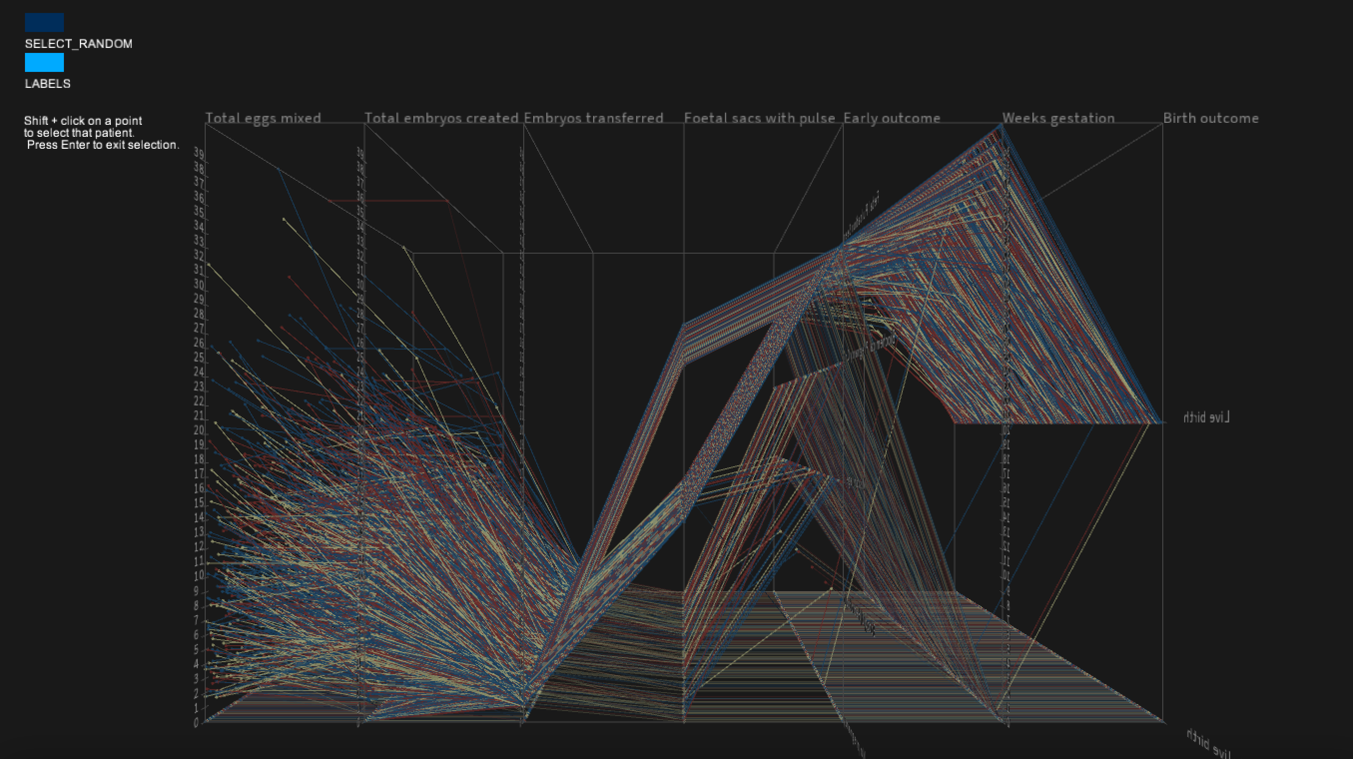 I have taken ~3000 samples from this dataset--1000 patients with male partners, 1000 with female partners, and 1000 without a partner-- and visualized some of the steps they underwent while having IVF treatment. The visualization allows the user to select a patient manually or randomly, and will display a text description of their IVF treatment.