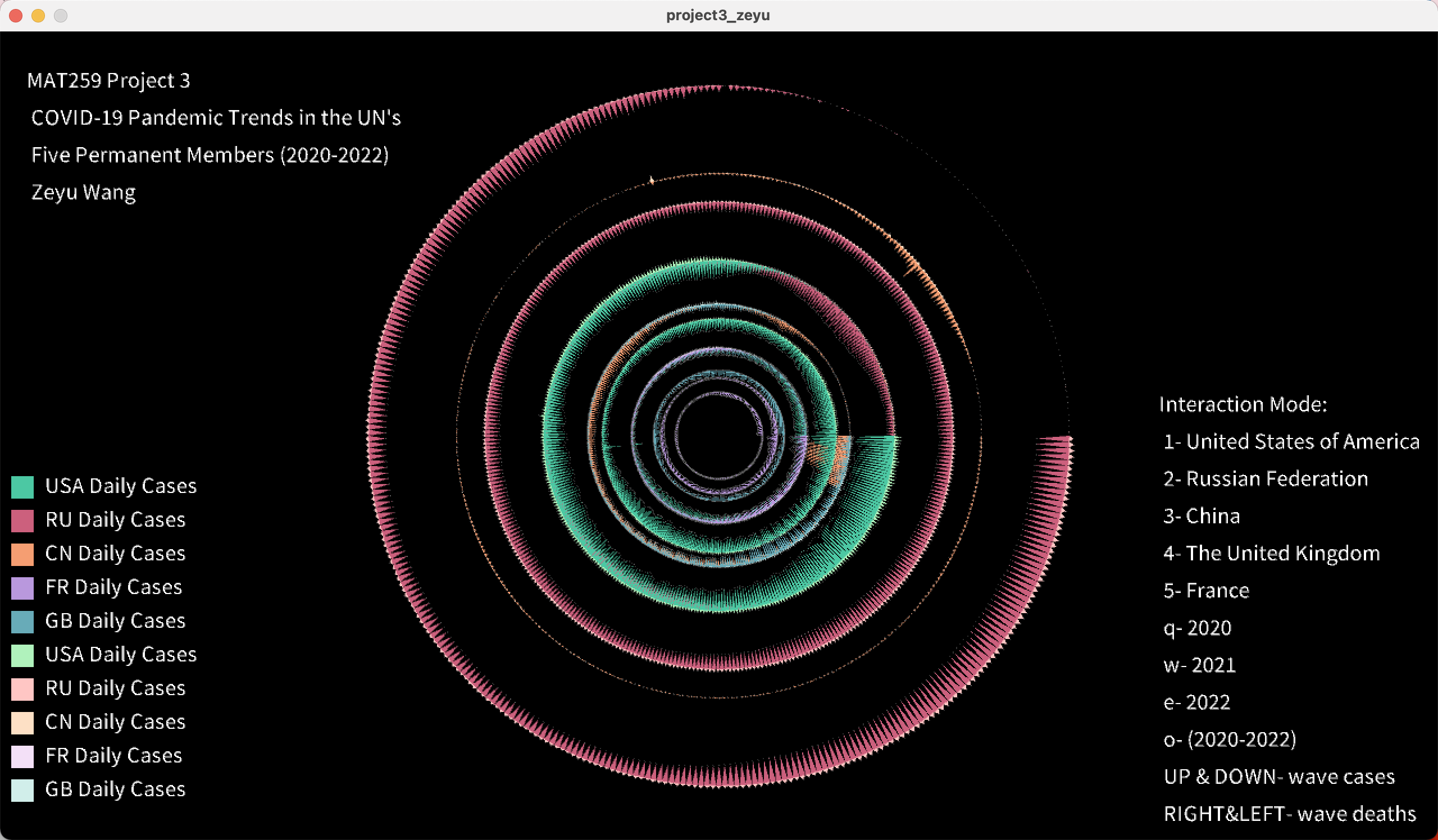 My idea is to create a data visualization of COVID-19 cases and deaths in the past three years for the five permanent members of the United Nations: UK, Russia, France, USA, and China. The visualization aims to compare and contrast the different government strategies implemented in each country and how they have affected the development of the pandemic. I have already completed the data preprocessing and have a clear sketch of how the data will be presented. Initially, my focus will be on creating the visualization, but I may explore the correlation between vaccination rates and COVID-19 deaths if time allows.