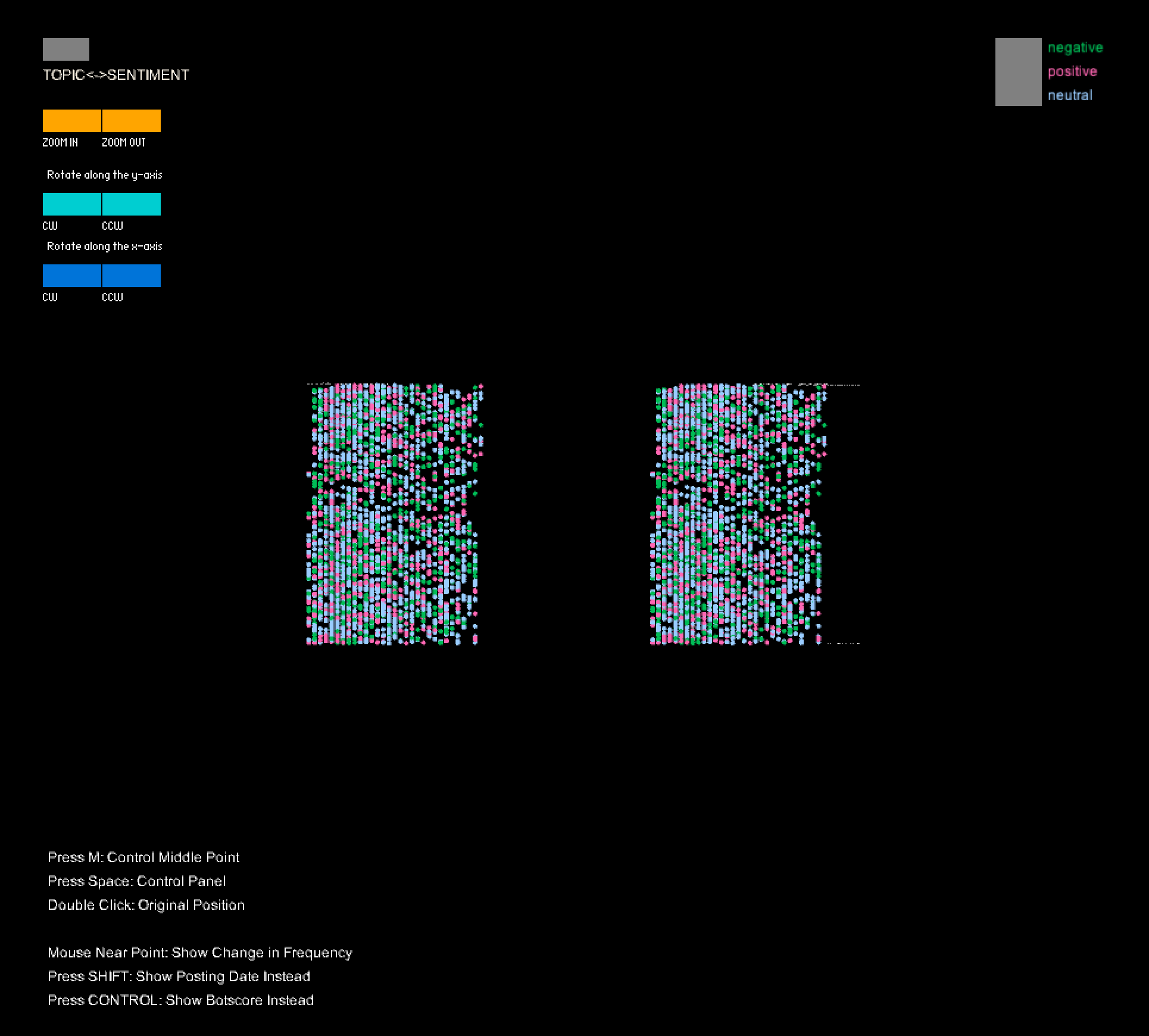 This is the first model I created for the Social Dilemma Twitter dataset. Three color presented three sentiments (neutral, positive, negative). As seen from the screenshot, most lines collapsed at the bottom of the previous model and it was difficult to discover patterns. I am planning to use a new 3D model (create a curve for each user instead of a straight line; the height of the curve depends on the difference between the post frequencies of the user 30 days before and after; if the frequency increases, the curve will be above a surface, and if it decreases, the curve will be under the surface; more control elements will be added to show the different topic groups).