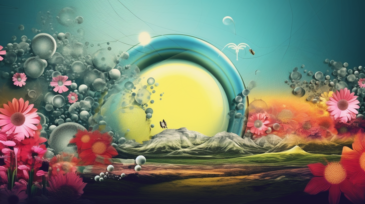 My images are all reminiscent of early 2000s digitalism "frutiger metro/aero" aesthetics. This first prompt was an attempt to brainstorm directions to subvert the aesthetic somehow. I was pretty happy with the images. I liked that they blended realism and surrealism in a cartoon-y style. "Collage" was initially intended to generate lots of images to branch off of, but I liked the visually interesting layout so I kept it in future prompts.