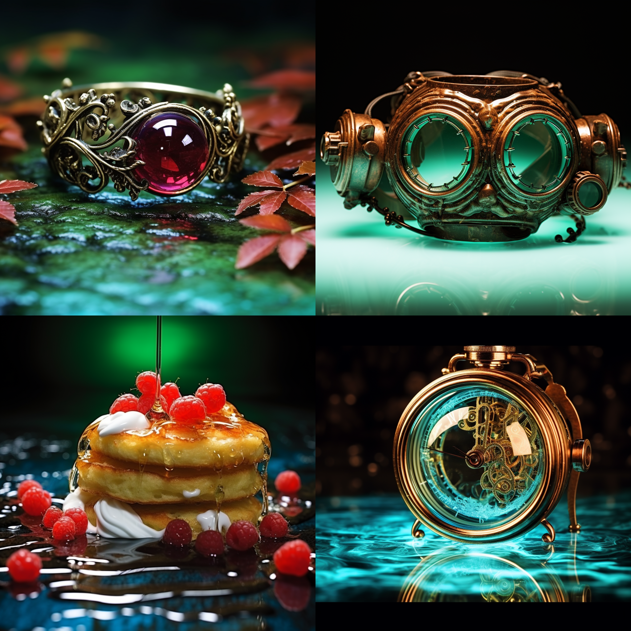Series 3: Prompt: https://s.mj.run/Vzzd2t8XRLg , https://s.mj.run/wAXvN30npBA , https://s.mj.run/2Lk5njr3Sog --style raw --s 250 Without any text input, the bot once again made advertisements. I am not sure if the placement of the green rings in one of the images has anything to do with why it made more product ads, but this time it didn't use the city as a background. It barely used the orange forest's original concept at all at a glance. The forest was turned into the orange copper in the items, as well as produced the leaves in the first image, but the blue water was more prevalent, and it begs the question if the bot is much more biased toward blue than orange. I'm unhappy with the fact it produced more advertisements, and not a sort of forest with green and blue hues on top of the orange. It appears the bot is biased toward making advertisements, as that may be what the developers intend to market it as. A cheap way for companies to produce advertisements.