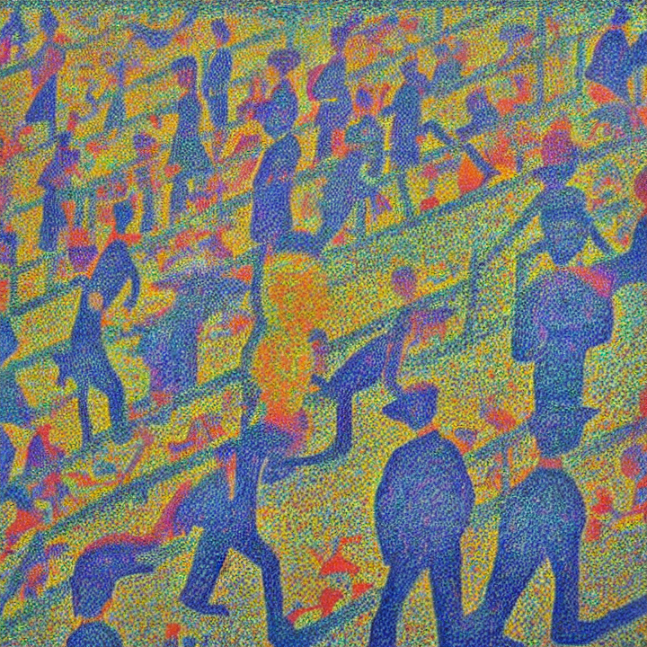 Georges Seurat (1859-1891) was a French painter who played a significant role in the development of a painting technique known as "pointillism." Pointillism involves creating pictures using tiny dots of colour placed closely together, which, when viewed from a distance, blend to form a complete and detailed image. As we see here, my idea to use the noise patterns as the Pointillist brush strokes made famous by the Seurat. But in this first attempt, the noise patterns seemed to have turned out more prominent than I had expected them to be. As a result, the pointillist strokes seems overdone. However, it does end up rendering an overall dreamlike atmosphere to the picture. The difference between these images and the ones created on MIdjourney are in their closeness to Seurat’s Pointillist brush strokes or emulate Vincent Van Gogh's 'Stary NIghts' (1889) {for instance, see the V4 of the Midjourney Image posted above}. Even though, the images in Midjourney looked a bit more refined, they feel like photographs or digital drawings manipulated in Photoshop to achieve the pointillist effect. In some instances, it is confusing to ascertain whether the Midjourney images were really following 's Seurat’s style Whereas the SDXL images seem to have that enigmatic quality and iconic ambiguity, typical of a pointillist painting where instead of regular brushstrokes, pictures are created by putting tiny dots of paint closely knit and right next to each other. Objects and figures are less clearly comprehensible in pointillist works and one needs to interpret or apprehend it by observing closely. Even though, the rendition was a bit too course and required refinement, I was happy that it was going in the direction I had hope for. Furthermore, as with Midjourney's images, it remains uncertain whether the scene is underwater or if the human figures can be perceived as students. The sampling steps were set at 60, with the Sampler enabled at Checkpoint: v1-5-pruned-emaonly.safetensors [6ce0161689]and I set it to be Switched at: 0.6