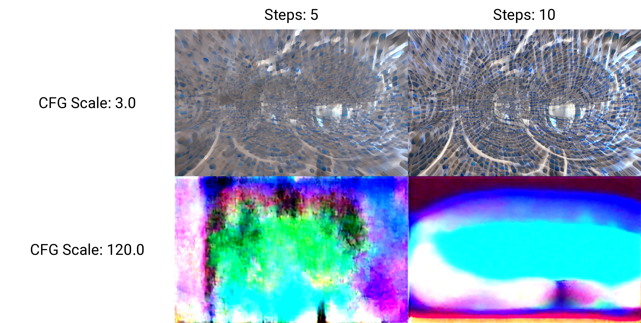 - CFG Scale: around 7.0, up to 14 ; lower → more abstract, broken images | higher → more “finished” images