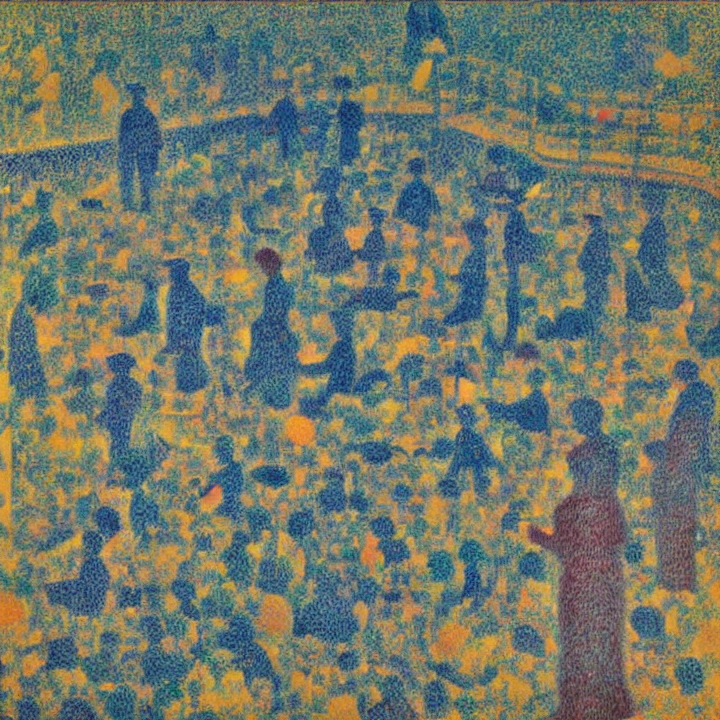 Georges Seurat (1859-1891) was a French painter who played a significant role in the development of a painting technique known as "pointillism." Pointillism involves creating pictures using tiny dots of colour placed closely together, which, when viewed from a distance, blend to form a complete and detailed image. As we see here, my idea to use the noise patterns as the Pointillist brush strokes made famous by the Seurat. But in this first attempt, the noise patterns seemed to have turned out more prominent than I had expected them to be. As a result, the pointillist strokes seems overdone. However, it does end up rendering an overall dreamlike atmosphere to the picture. The difference between these images and the ones created on MIdjourney are in their closeness to Seurat’s Pointillist brush strokes or emulate Vincent Van Gogh's 'Stary NIghts' (1889) {for instance, see the V4 of the Midjourney Image posted above}. Even though, the images in Midjourney looked a bit more refined, they feel like photographs or digital drawings manipulated in Photoshop to achieve the pointillist effect. In some instances, it is confusing to ascertain whether the Midjourney images were really following 's Seurat’s style Whereas the SDXL images seem to have that enigmatic quality and iconic ambiguity, typical of a pointillist painting where instead of regular brushstrokes, pictures are created by putting tiny dots of paint closely knit and right next to each other. Objects and figures are less clearly comprehensible in pointillist works and one needs to interpret or apprehend it by observing closely. Even though, the rendition was a bit too course and required refinement, I was happy that it was going in the direction I had hope for. Furthermore, as with Midjourney's images, it remains uncertain whether the scene is underwater or if the human figures can be perceived as students. The sampling steps were set at 60, with the Sampler enabled at Checkpoint: v1-5-pruned-emaonly.safetensors [6ce0161689]and I set it to be Switched at: 0.6