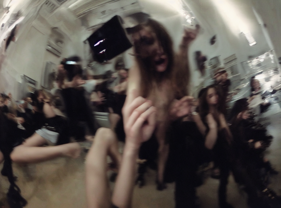 010s tumblr bloghouse indie sleaze, 2013 instagram, intensely bright direct flash photography, model in foreground wearing rick owens balenciaga maison margiela, intense motion blur, fisheye perspective, crystal castles, colorized