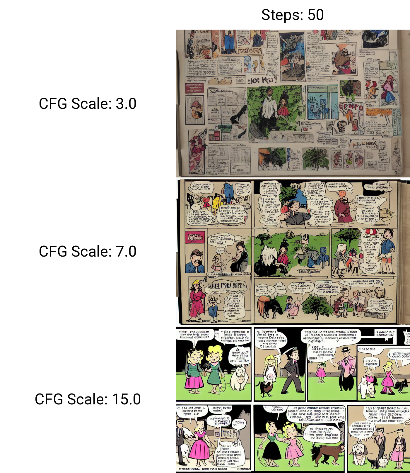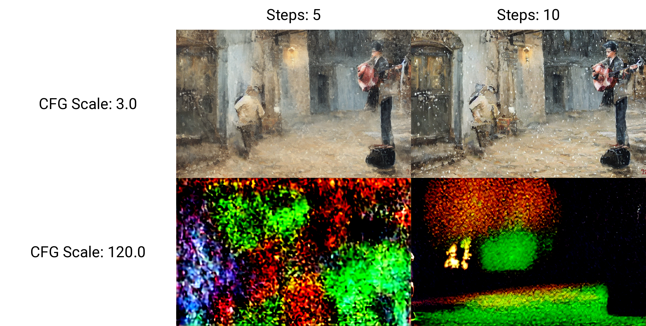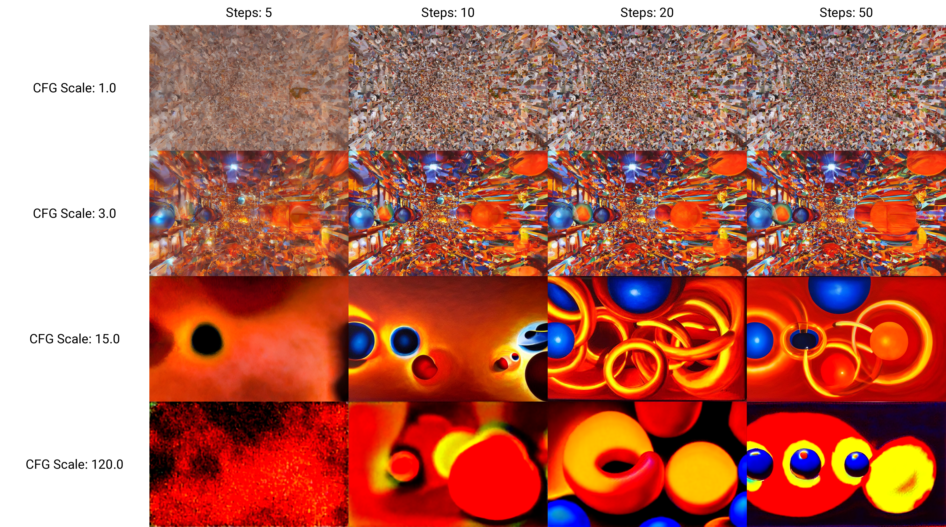 - CFG Scale: around 7.0, up to 14 ; lower → more abstract, broken images | higher → more “finished” images