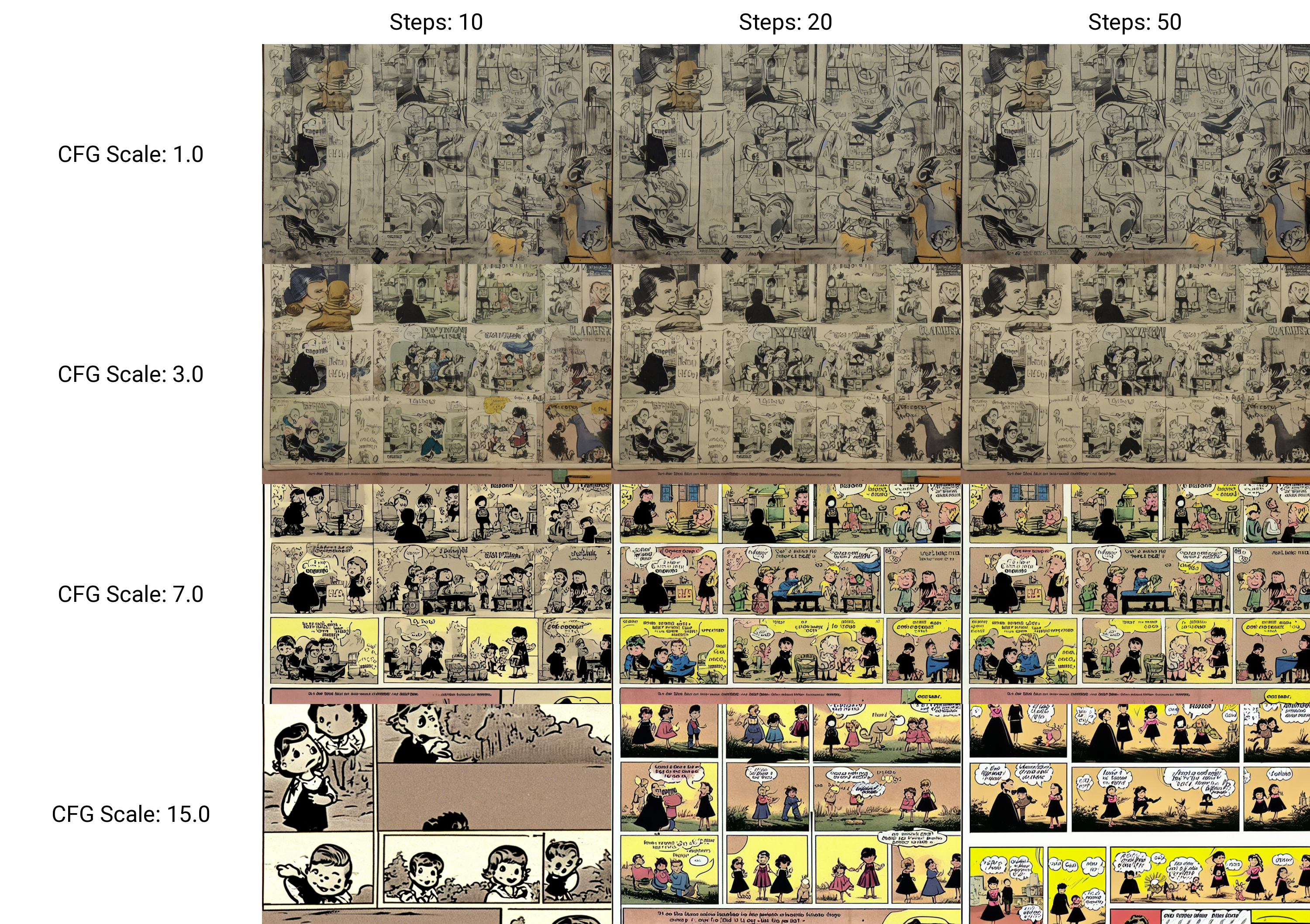 comic book scene strip based on 1950s style hand drawn illustruations, simple colors, heavy black outlines. Sepia colors, story unfolding through multiple scenes about a six year old girl who has a dog and loses a yellow balloon in some trees. Looks like it is within a paper print newsprint Negative prompt: abstract lines Steps: 10, Sampler: DPM++ 2M Karras, CFG scale: 1.0, Seed: 1157974087, Size: 800x510, Model hash: 6ce0161689, Model: v1-5-pruned-emaonly, Script: X/Y/Z plot, X Type: Steps, X Values: "10, 20, 50", Y Type: CFG Scale, Y Values: "1.0, 3.0, 7.0, 15.0", Version: v1.6.0