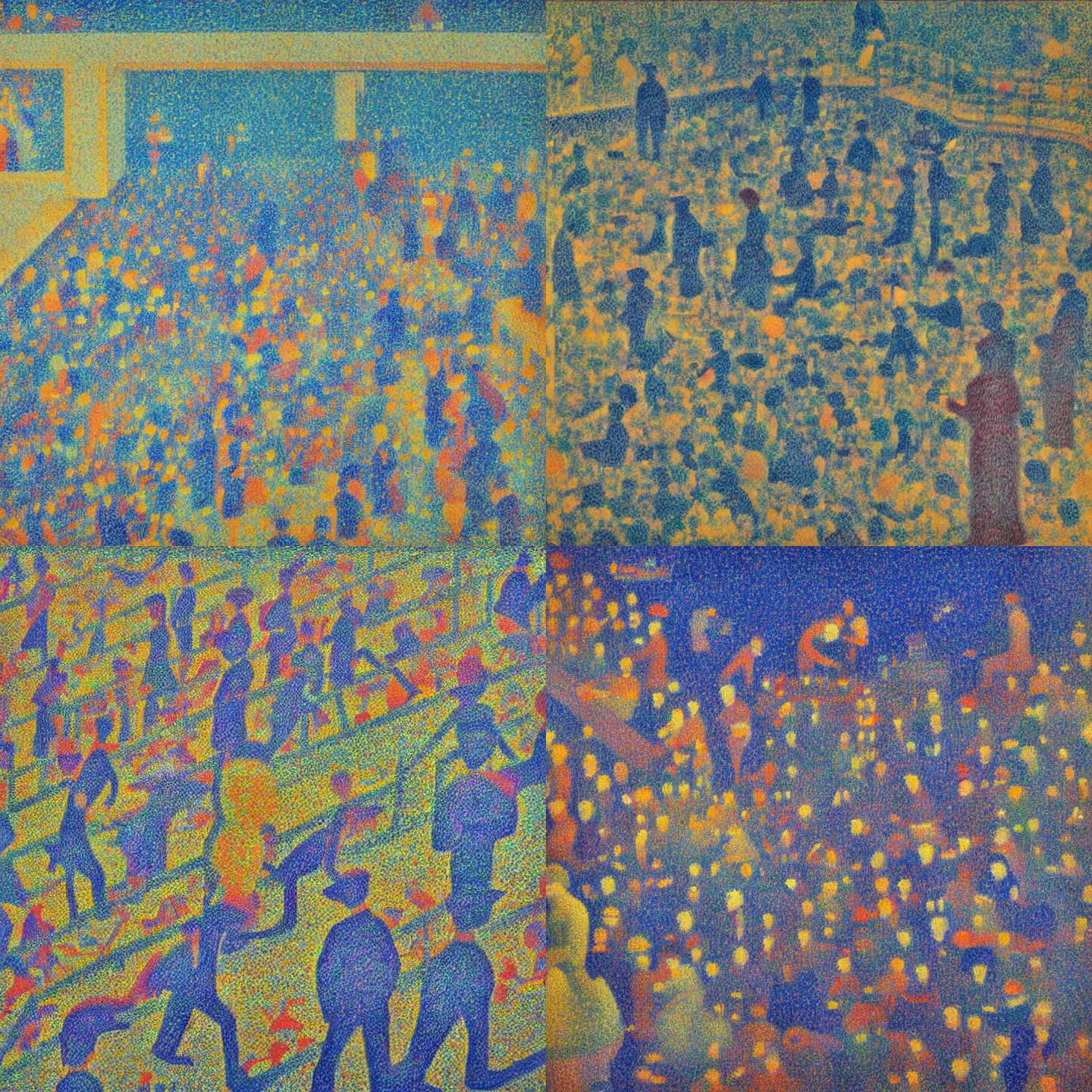 Georges Seurat (1859-1891) was a French painter who played a significant role in the development of a painting technique known as "pointillism." Pointillism involves creating pictures using tiny dots of colour placed closely together, which, when viewed from a distance, blend to form a complete and detailed image. As we see here, my idea to use the noise patterns as the Pointillist brush strokes made famous by the Seurat. But in this first attempt, the noise patterns seemed to have turned out more prominent than I had expected them to be. As a result, the pointillist strokes seems overdone. However, it does end up rendering an overall dreamlike atmosphere to the picture. The difference between these images and the ones created on MIdjourney are in their closeness to Seurat’s Pointillist brush strokes or emulate Vincent Van Gogh's 'Stary NIghts' (1889) {for instance, see the V4 of the Midjourney Image posted above}. Even though, the images in Midjourney looked a bit more refined, they feel like photographs or digital drawings manipulated in Photoshop to achieve the pointillist effect. In some instances, it is confusing to ascertain whether the Midjourney images were really following 's Seurat’s style Whereas the SDXL images seem to have that enigmatic quality and iconic ambiguity, typical of a pointillist painting where instead of regular brushstrokes, pictures are created by putting tiny dots of paint closely knit and right next to each other. Objects and figures are less clearly comprehensible in pointillist works and one needs to interpret or apprehend it by observing closely. Even though, the rendition was a bit too course and required refinement, I was happy that it was going in the direction I had hope for. Furthermore, as with Midjourney's images, it remains uncertain whether the scene is underwater or if the human figures can be perceived as students. The sampling steps were set at 60, with the Sampler enabled at Checkpoint: v1-5-pruned-emaonly.safetensors [6ce0161689]and I set it to be Switched at: 0.6