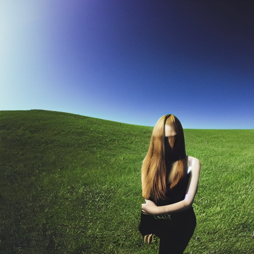 grassy hills, blue cloudy sky, bright direct flash digital camera photography, fisheye perspective, model in foreground wearing rick owens balenciaga, motion blur, clipping glitch contortion, lsd dream emulator