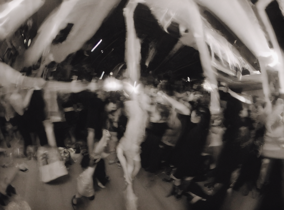 010s tumblr bloghouse indie sleaze, 2013 instagram, intensely bright direct flash photography, model in foreground wearing rick owens balenciaga maison margiela, intense motion blur, fisheye perspective, crystal castles, colorized
