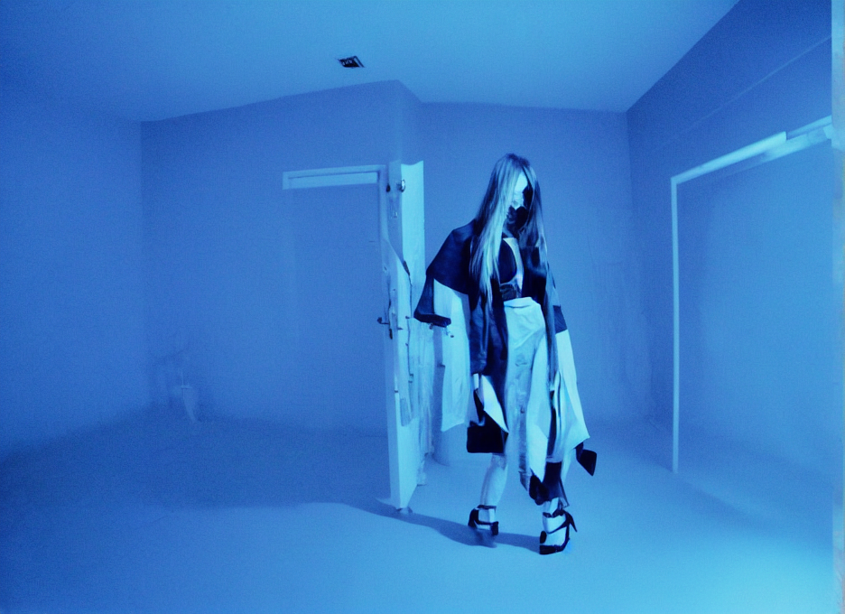 2010s tumblr bloghouse indie sleaze, 2013 instagram, intensely bright direct flash photography, model in foreground wearing rick owens balenciaga maison margiela, intense motion blur, fisheye perspective, crystal castles, colorized, empty room, rasquachismo art, virgin mary